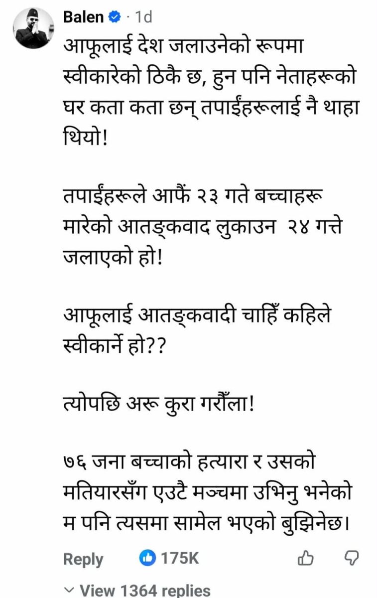 सोमबार बिहानसम्म ओलीको पोस्टमा लाइक गर्नेको संख्या ६६ हजार रहेको छ भने त्यो अवधिमा उनकै पोस्टमा कमेन्ट गरिएको बालेनको कमेन्टमा लाइक गर्नेको संख्या एक लाख ७५ हजार पुगेको छ।