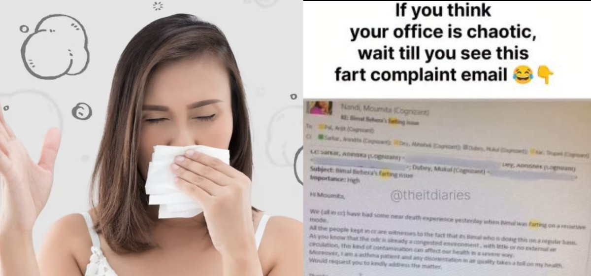 उजुरीमा एक कर्मचारीले आफ्ना सहकर्मीले दिनहुँ ग्यास (पाद) छोडेर कार्यालयको वातावरण बिगारेको उल्लेख गरेका छन्। कार्यालयमा हावापानीको उचित व्यवस्था नहुँदा यो समस्याले काममा बाधा पुगेको र स्वास्थ्यमा समेत असर परेको इमेल गरिएको पत्रमा उल्लेख छ। उजुरी गर्ने कर्मचारीहरूले यो व्यवहारले सहकर्मीहरूबिच असहजता र तनाव बढाएको पनि बताएका छन्। उनीहरूले एचआरसँग सम्बन्धित सहकर्मीलाई चेतावनी दिन, हावापानी सुधार्ने उपकरण जडान गर्न वा व्यवहार सुधार्न निर्देशन दिन माग गरेका छन्।