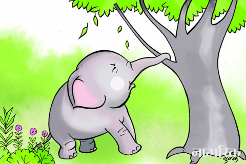 जङ्गलको बीचमा एउटा ठूलो पोखरी थियोे। पोखरी वरिपरि धेरै जङ्गली जनावरको आश्रयस्थल थियो। त्यो पोखरीको पानीमा धेरै जनावरहरू आश्रित थिए। त्यहाँ हात्तीहरूको एउटा ठूलो बथान पनि बस्थे।