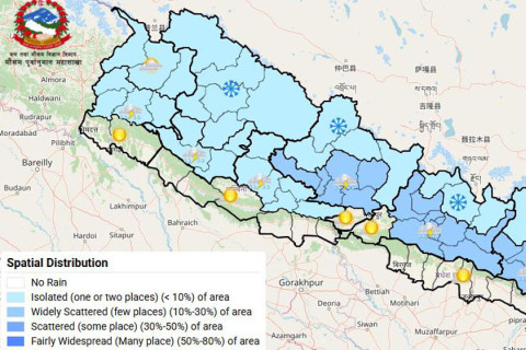 कोशी र गण्डकी प्रदेशका पहाडी भागका एक–दुई स्थानमा मेघगर्जन र चट्याङसहित हल्का वर्षाको सम्भावना छ। साथै, उच्च पहाडी तथा हिमाली भागका एक–दुई स्थानमा हल्का हिमपात पनि हुन सक्छ।