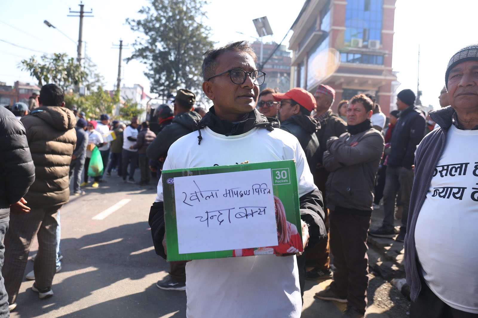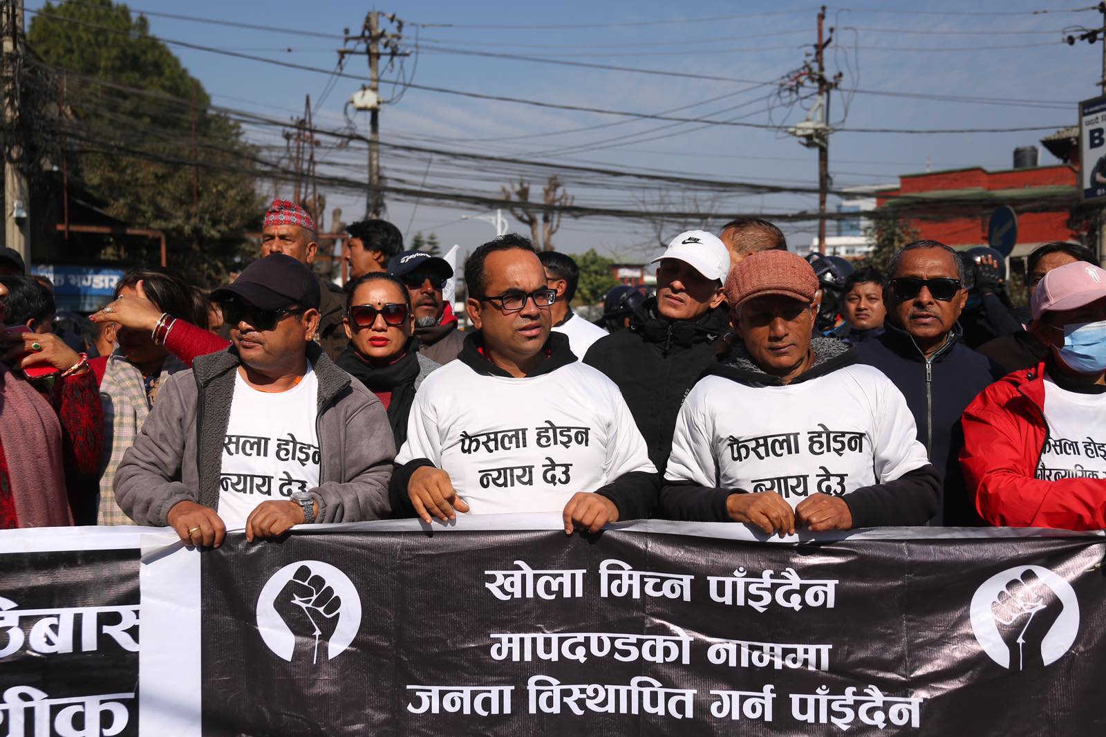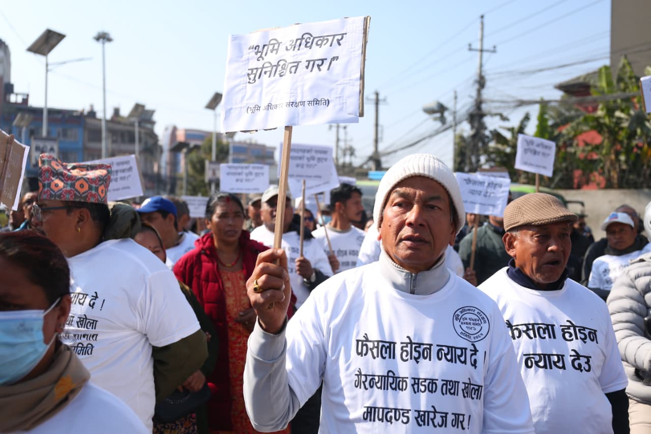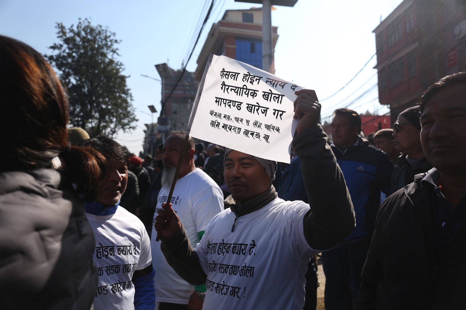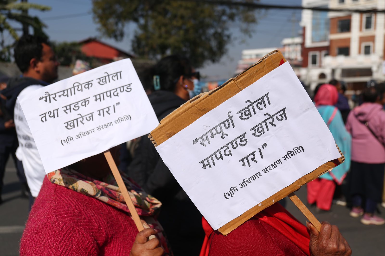 प्रदर्शनीमा ‘फैसला होइन न्याउ देउ, गैर न्यायिक खोला मापदण्ड खारेज गर’, ‘जनतालाई उठिबास गर्ने गैर न्यायिक सडक तथा खोला मापदण्ड खारेज गर’, ‘खोला मिच्न पाइँदैन, मापदण्डको नाममा जनता विस्थापित गर्न पाइँदैन’, ‘खोला नदीको मापदण्ड खारेज गर’ भन्ने नाराका साथ विरोध प्रदर्शन भएको हो।