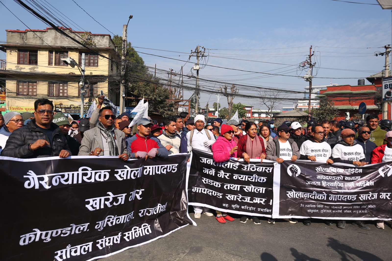 काठमाडौं उपत्यकाका सडक र खोला किनारका बासिन्दाहरूले नदी तथा खोलाको मापदण्ड खारेजीको माग गर्दै प्रदर्शन गरेका छन्।
