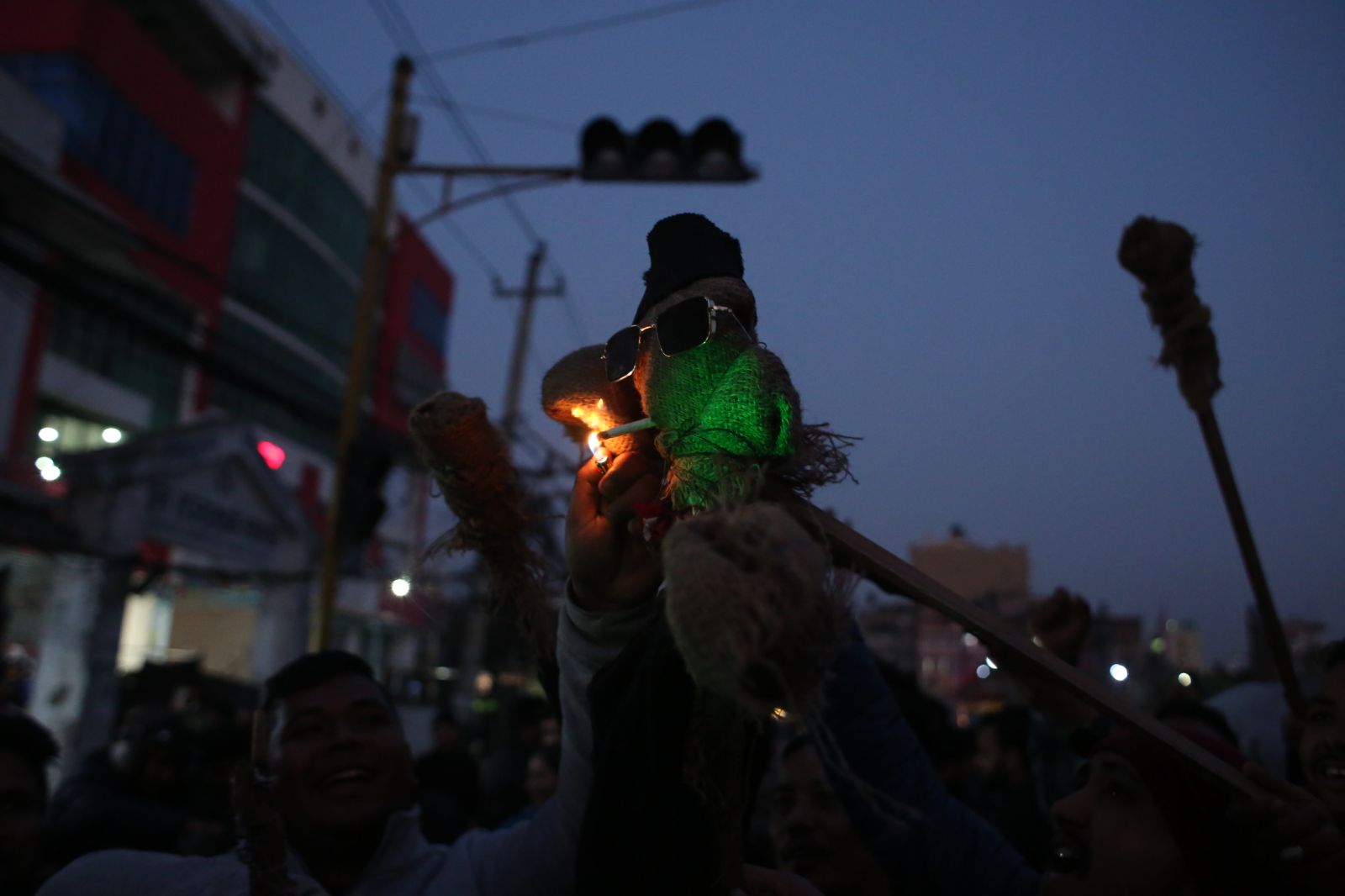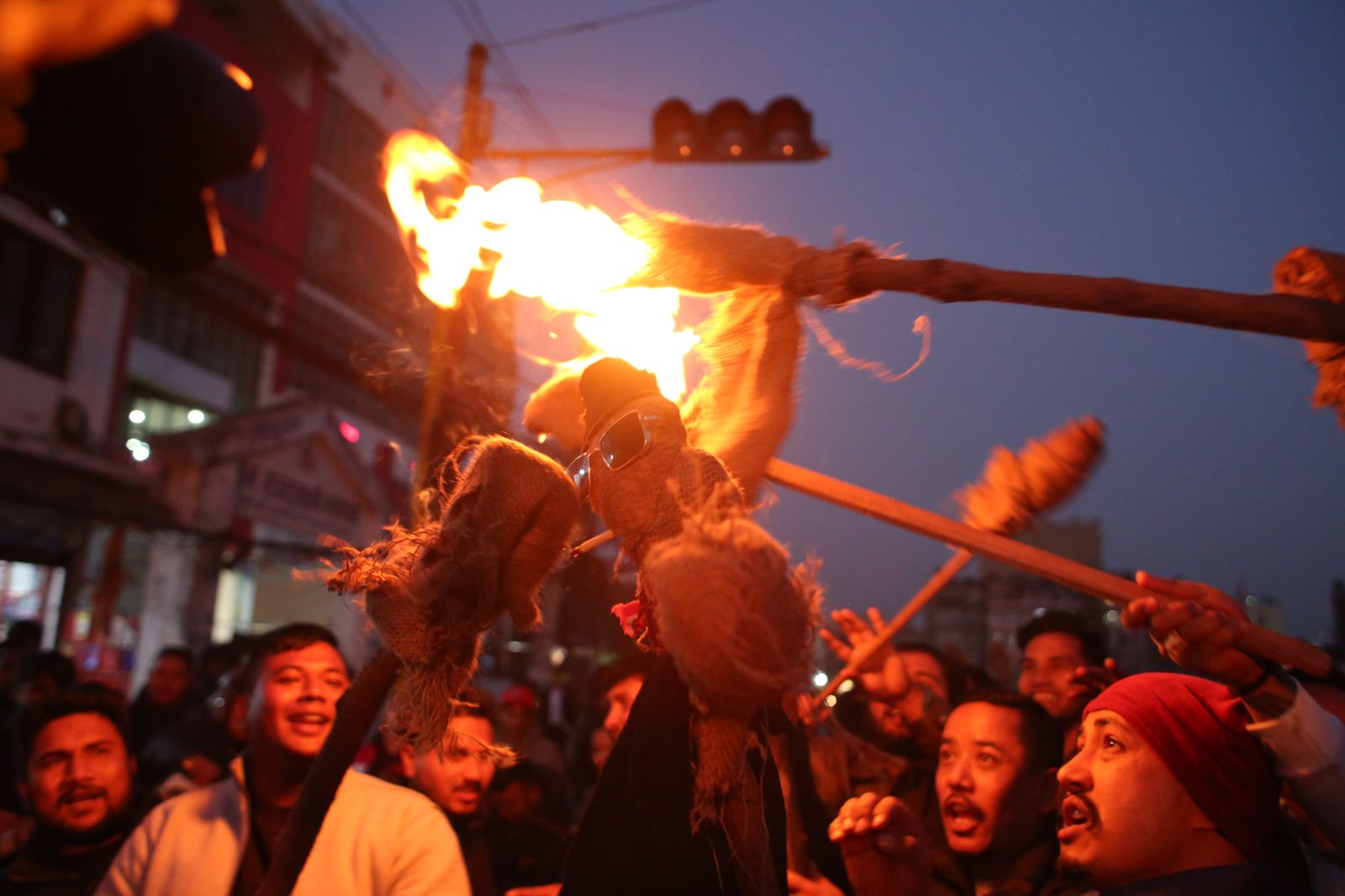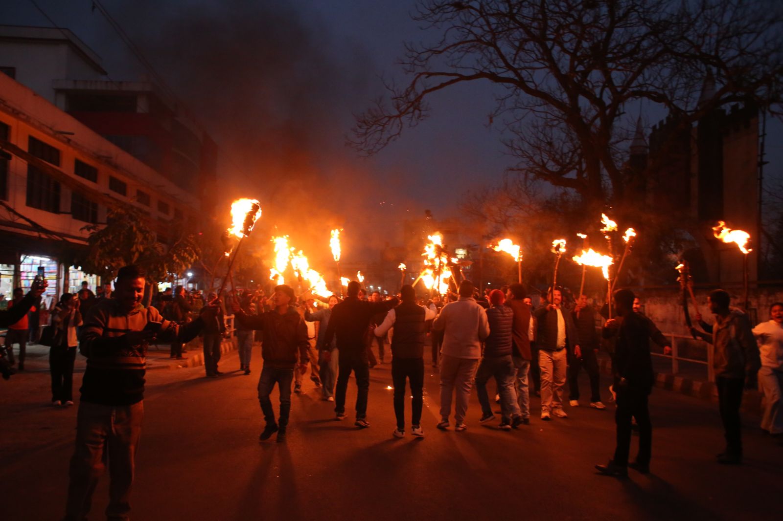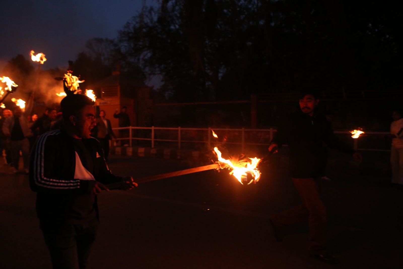 नेकपा एमालेनिकट विद्यार्थी संगठन अनेरास्ववियुले दाङमा पार्टीको ‘सूर्य’ चिह्न अंकित झन्डा जलाएको घटनाको विरोध गर्दै काठमाडौंमा मसाल जुलुस निकालेको छ।