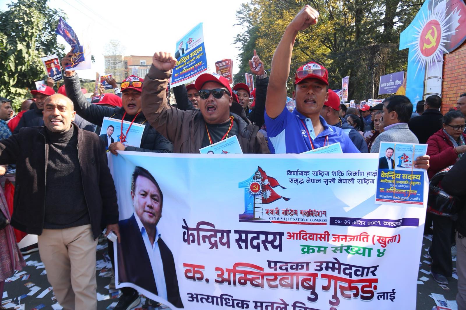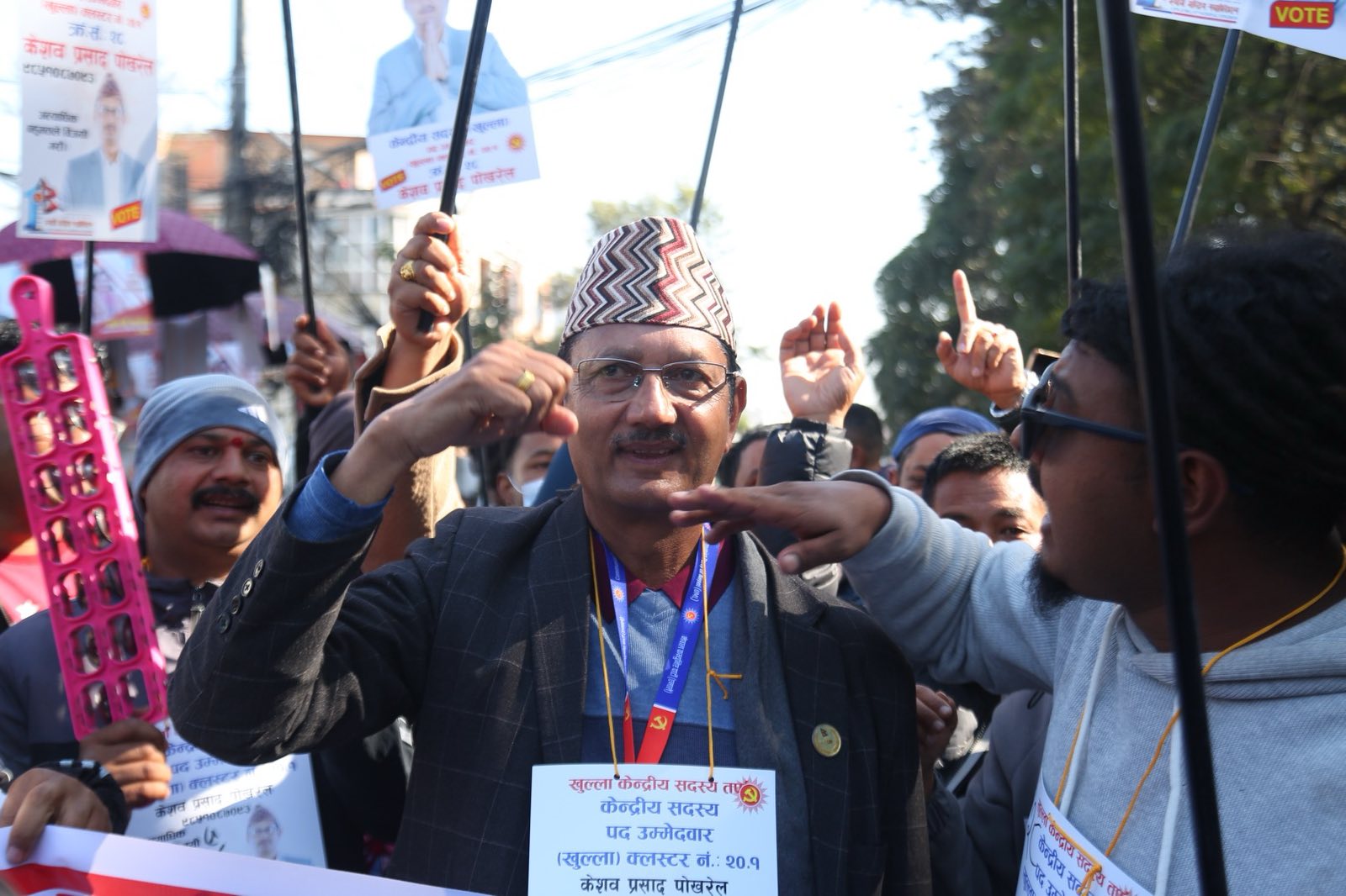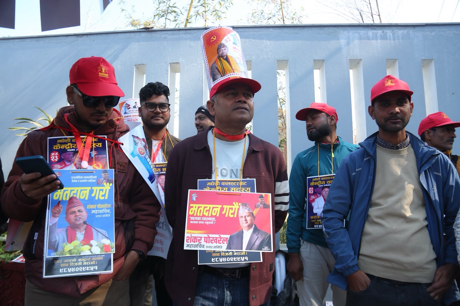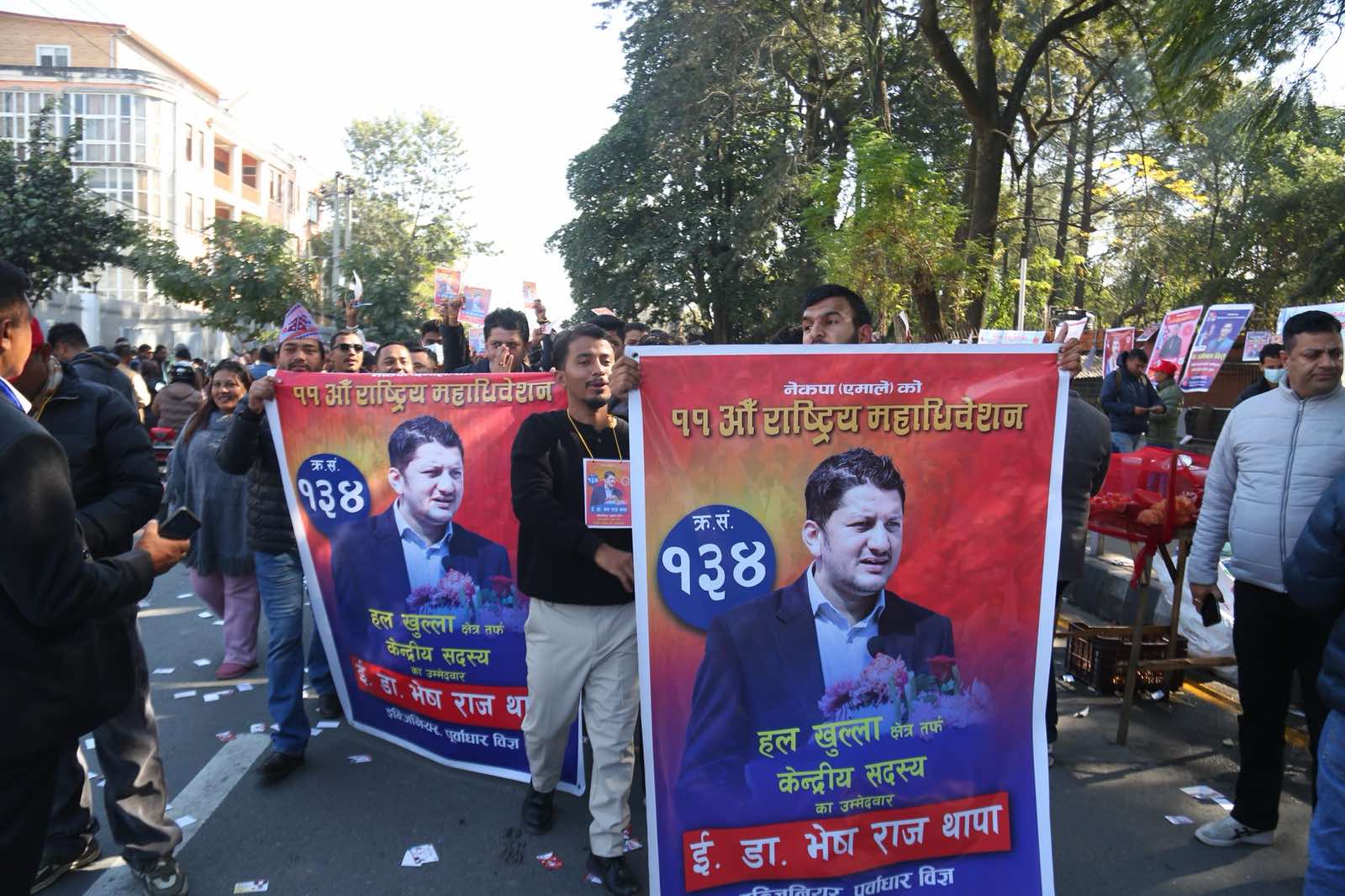 नेकपा एमालेको ११औँ राष्ट्रिय महाधिवेशनस्थल भृकुटीमण्डपमा चुनावी रौनक छाएको छ। उम्मेदवार र समर्थकहरू साना-साना समूह बनाएर मत माग्दै प्रदर्शन गरिरहेका छन्।