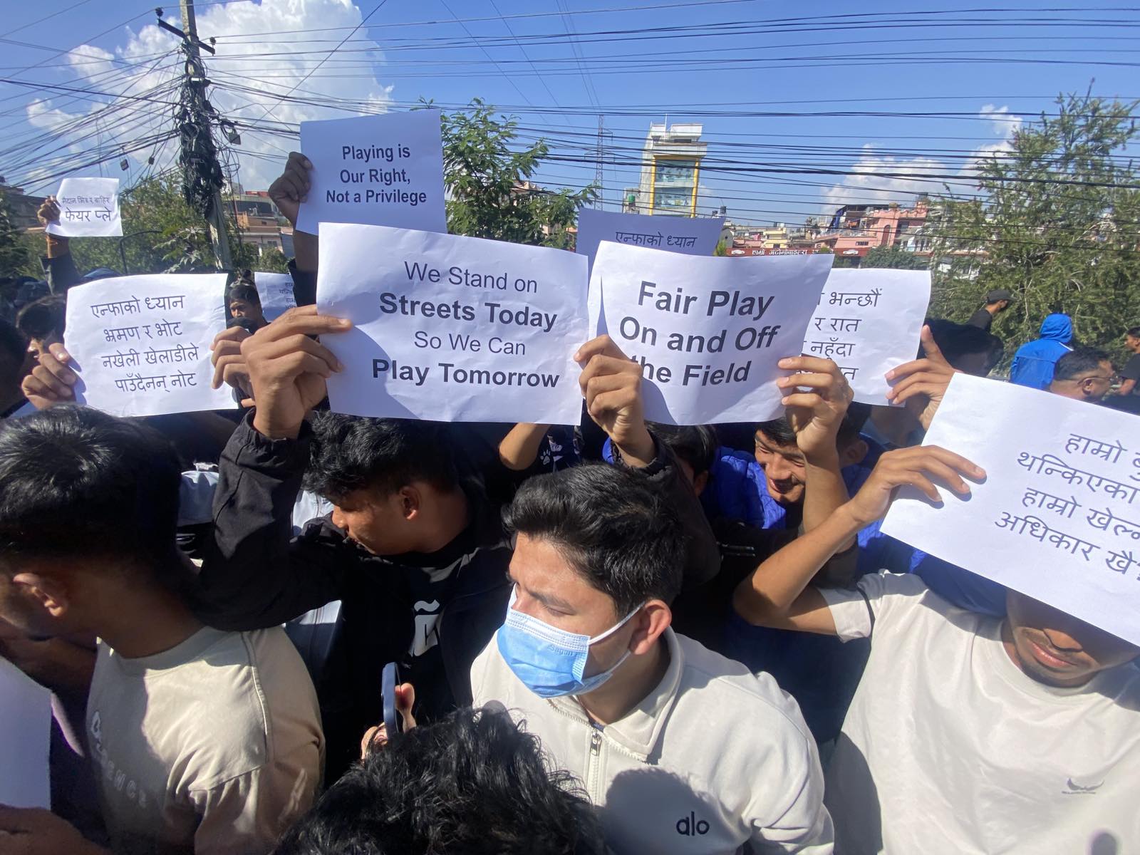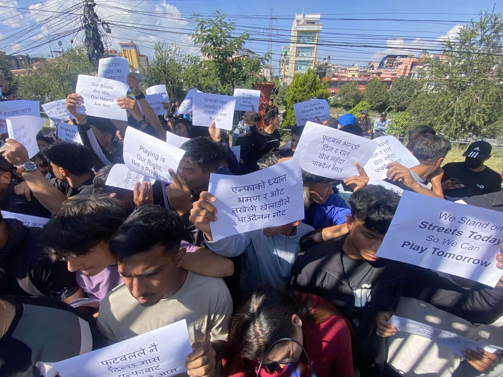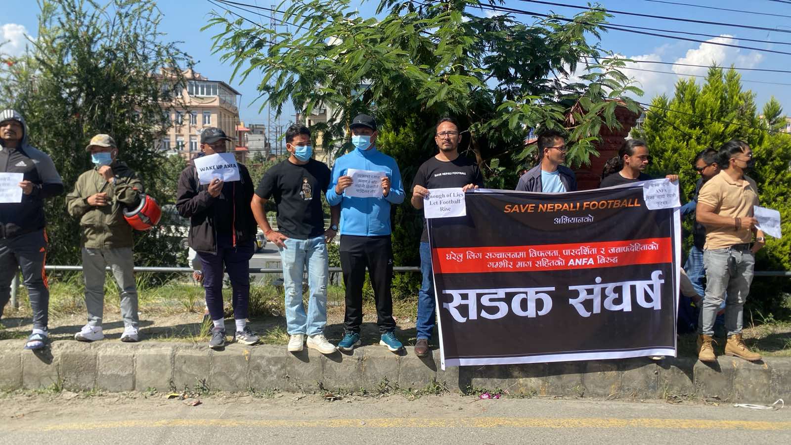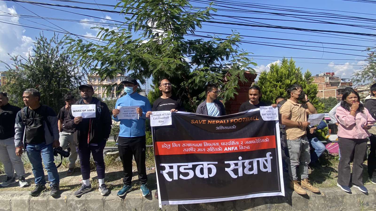 अखिल नेपाल फुटबल संघ (एन्फा) सातदोबाटोस्थित एन्फा मुख्यालय बाहिर खेलाडीहरूले प्रदर्शन गरेका छन्।