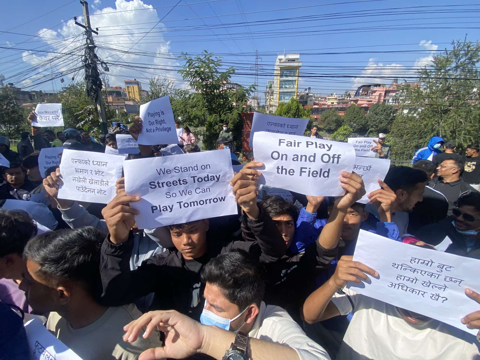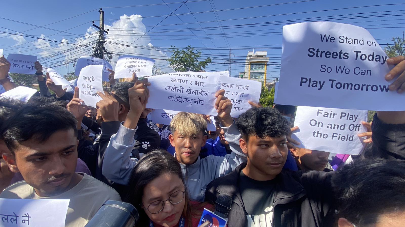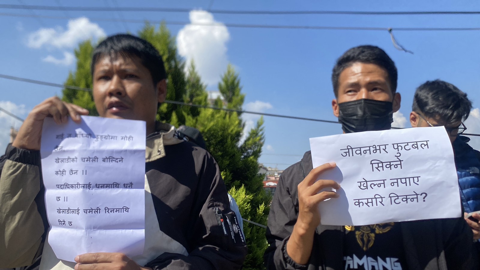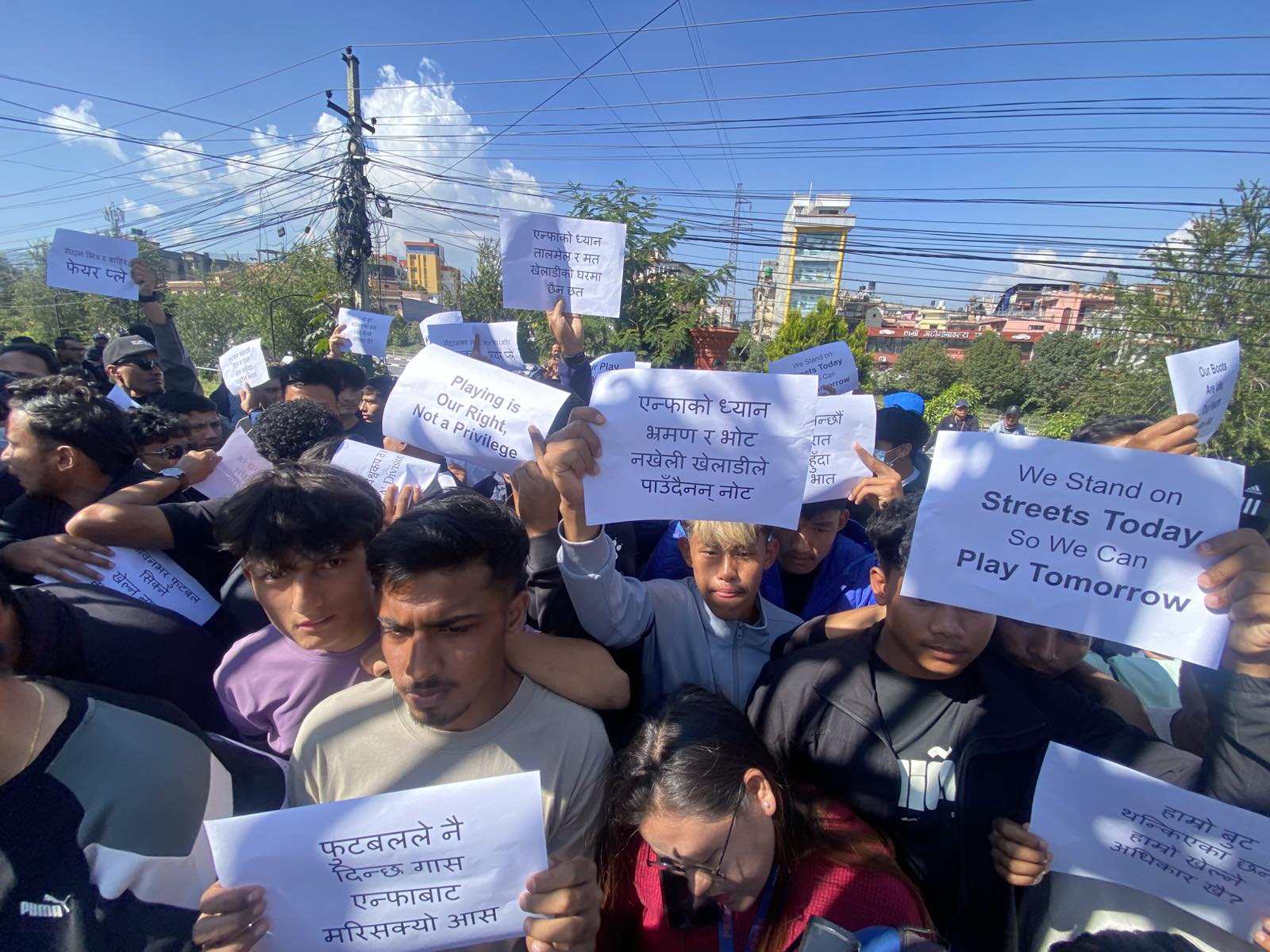 अखिल नेपाल फुटबल संघ (एन्फा) सातदोबाटोस्थित एन्फा मुख्यालय बाहिर खेलाडीहरूले प्रदर्शन गरेका छन्।