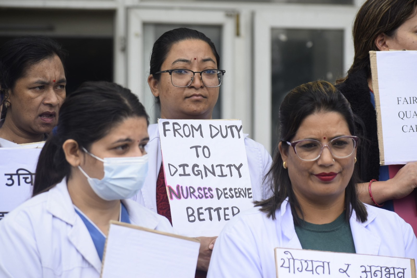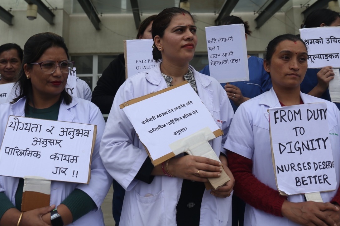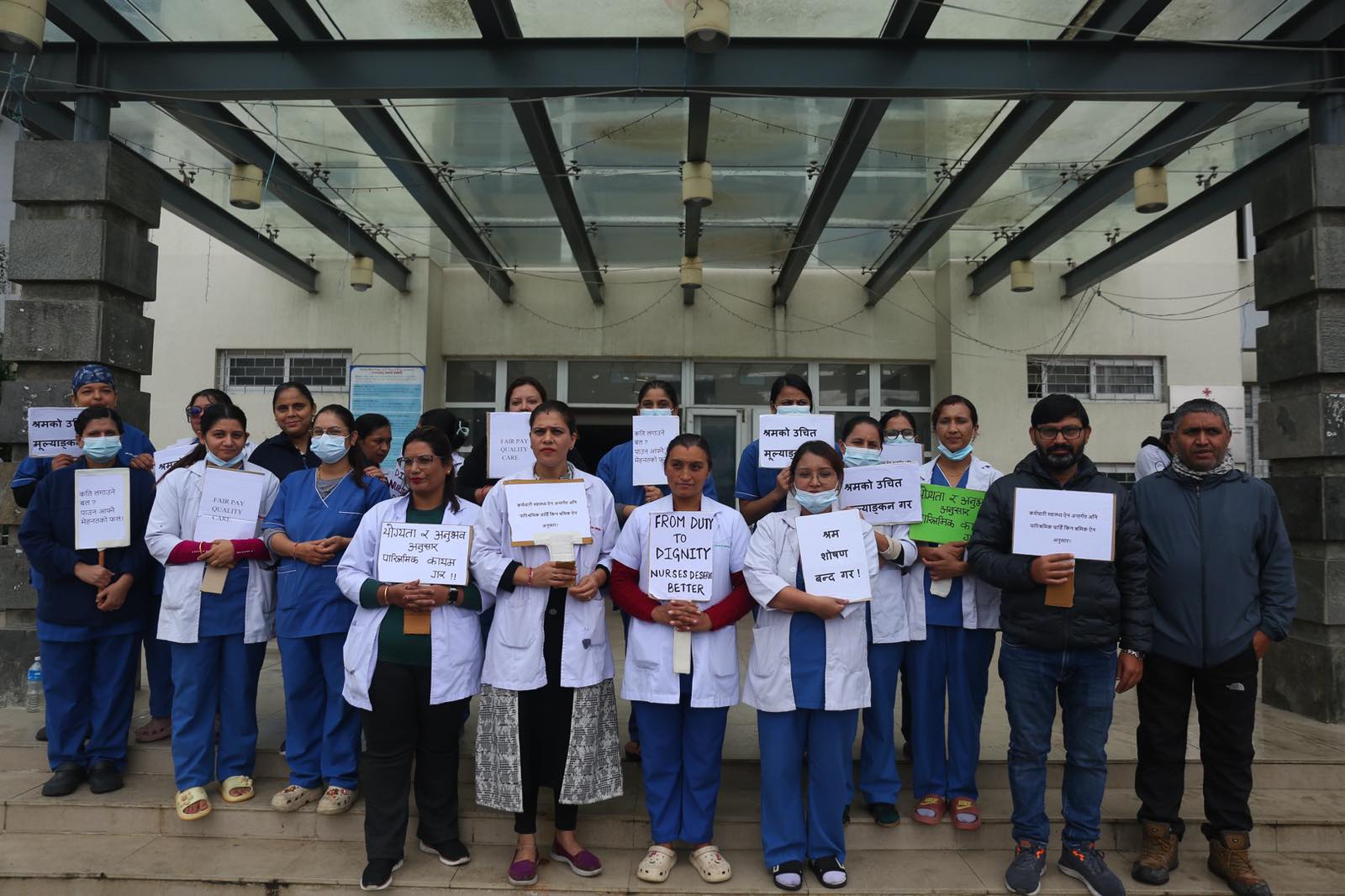 नेपाल नर्सिङ संघको आह्वानमा मिनभवन स्थित सिभिल हस्पिटलका नर्सहरूले आज अत्यावश्यक सेवा बाहेकका नर्सिङ सेवा २ घण्टा बन्द गरेर विरोध गरेका छन्।
