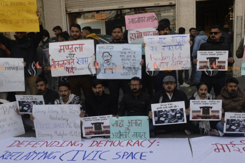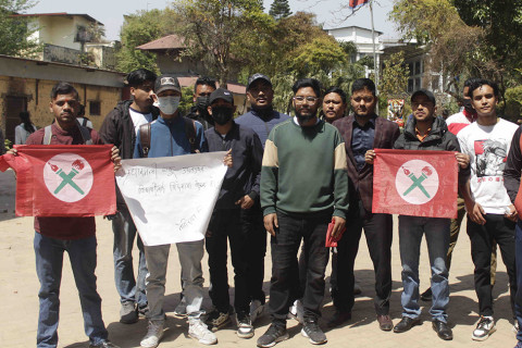 सत्तारूढ नेपाली कांग्रेसको भ्रातृ संस्था नेविसंघले माइतीघर मण्डलमा लगाएको निषेधाज्ञा हटाउन माग गर्दै प्रदर्शन गरेका छन्।