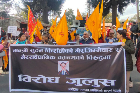 सनातन धर्मावलम्बी सम्पूर्ण नेपाली नामक संस्थाले संस्कृति, पर्यटन तथा नागरिक उड्ययन मन्त्री सुदन किराँतीको राजीनामा माग गर्दै विरोध प्रदर्शन गरेको छ।