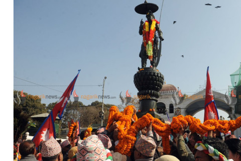 शाहको जन्मजयन्ती मनाउन सर्वसाधरणहरु बाजागाजासहित पुगेका छन्। धामीझाक्रीको भेषमा पुगेका उनीहरुले शाहको सालिकमा पुष्पहार अर्पण गरेका छन्।