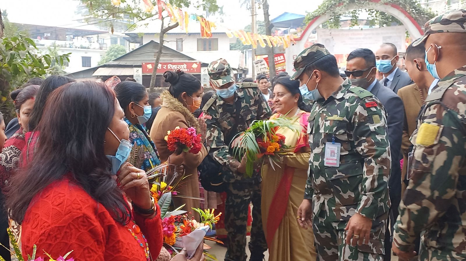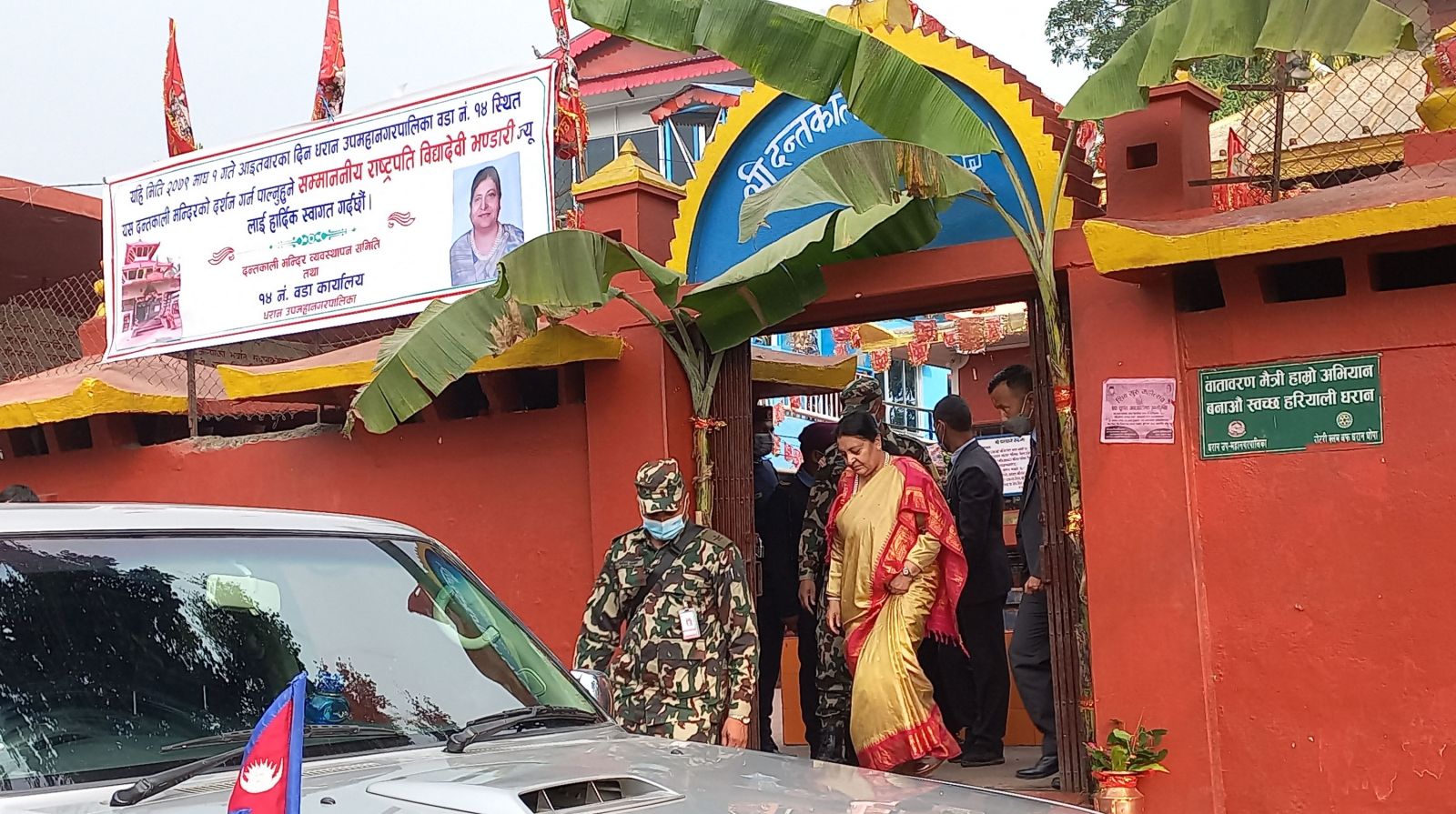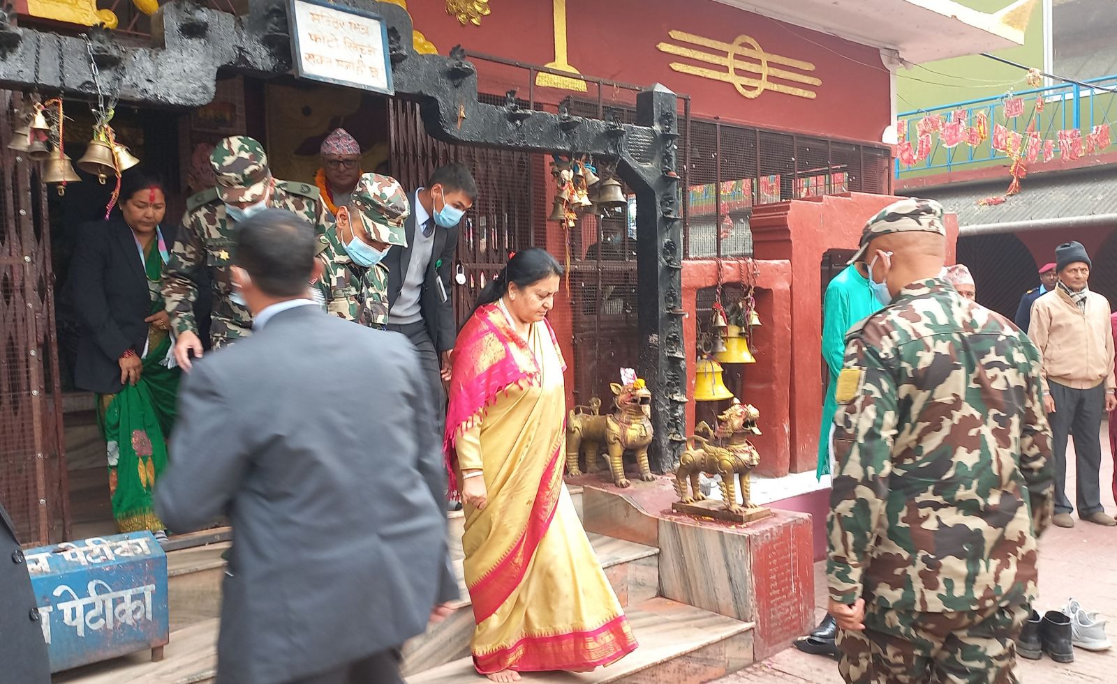 नेपाली सेनाको हेलिकप्टरद्वारा धरान आएकी उनले दन्तकाली, पिण्डेश्वर र बुढासुब्बा मन्दिरमा पूजा अर्चना गरेकी हुन्। यी तीन वटै मन्दिर धरान १४ विजयपुर गढीमा रहेको छ।
