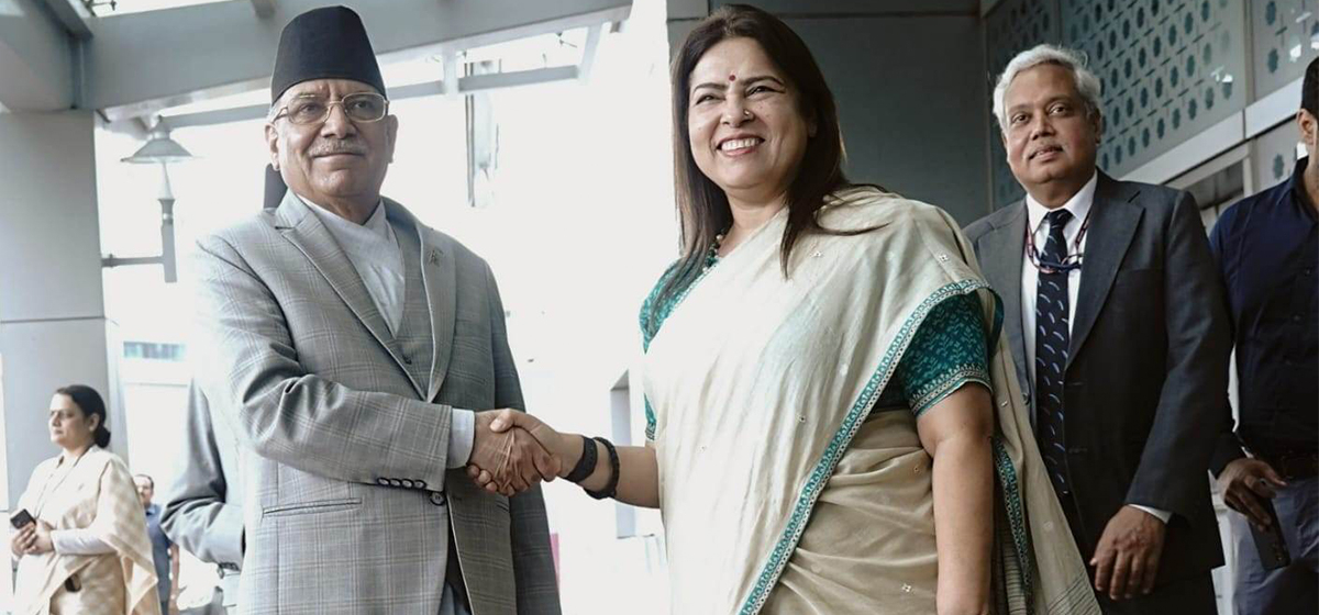 प्रधानमन्त्री पुष्पकमल दाहाललाइ इन्दिरा गान्धी अन्तरास्ट्रिय बिमानस्थलमा भारतीय बिदेश राज्यमन्त्री मिनाक्षी लेखीले स्वागत गरेकी छिन।
