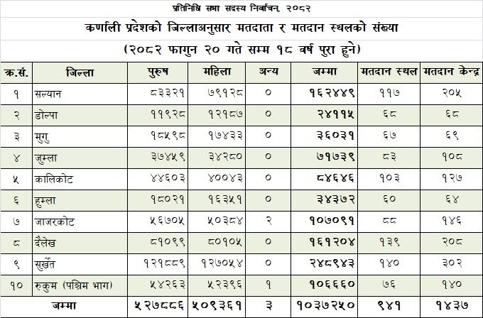 सल्यानमा एक लाख ६२ हजार ४४९, दैलेखमा एक लाख ६१ हजार २०४, जाजरकोटमा एक लाख सात हजार ९१, रुकुम पश्चिममा एक लाख छ हजार ६६०, कालीकोटमा ८४ हजार ६४६ मतदाता छन् । यस्तै जुम्लामा ७१ हजार ७३९, मुगुमा ३६ हजार ३१ र हुम्लामा ३४ हजार ३७२ मतदाता रहेको कर्णाली प्रदेश निर्वाचन कार्यालय सुर्खेतले जनाएको छ ।