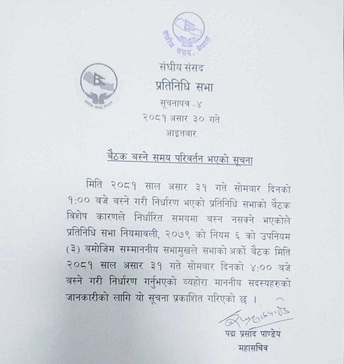 प्रतिनिधि सभाको सोमबारका लागि बोलाइएको बैठकको समय परिवर्तन भएको छ ।
