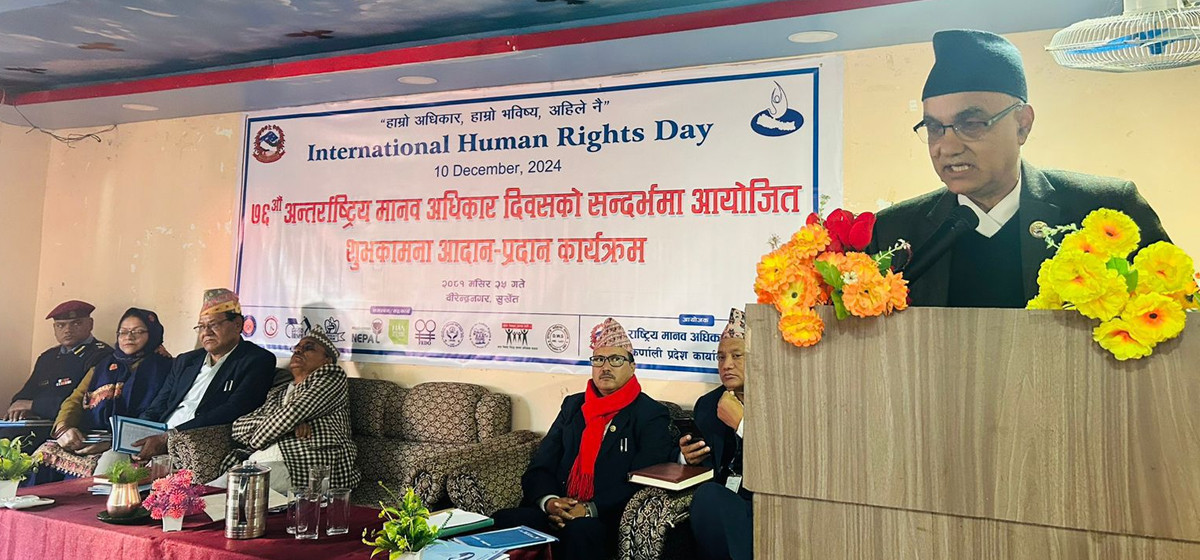 ७६ औं अन्तर्राष्ट्रिय मानवअधिकार दिवसका अवसरमा सुर्खेतमा आज आयोजित कार्यक्रममा मुख्यमन्त्री कडेलले मानव अधिकार भनेको केवल कानूनको विषय मात्र नभएर समाज निर्माणको आधारशिला भएको बताएका हुन्।