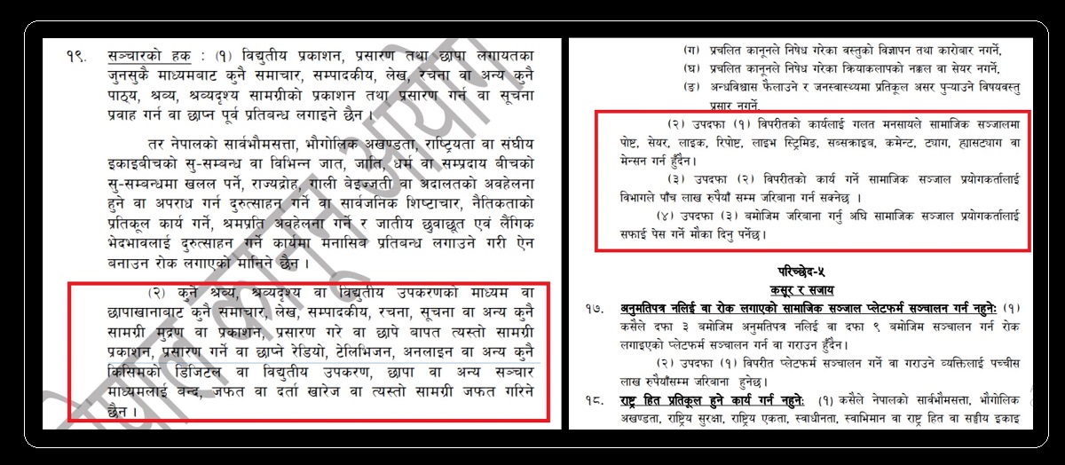 १९ कै २ मा थप प्रष्ट पारिएको छ, 'कुनै श्रव्य, श्रव्य-दृश्य वा विद्युतीय उपकरणको माध्यम वाछापाखानाबाट कुनै समाचार, लेख, सम्पादकीय, रचना, सूचना वा अन्य कुनैसामग्री मुद्रण वा प्रकाशन, प्रसारण गरे वा छापेबापत् त्यस्तो सामग्री प्रकाशन, प्रसारण गर्ने वा छाप्ने रेडियो, टेलिभिजन, अनलाइन वा अन्य कुनै किसिमको डिजिटल वा विद्युतीय उपकरण, छापा वा अन्य सञ्चारमाध्यमलाई बन्द, जफत वा दर्ता खारेज वा त्यस्तो सामग्री जफत गरिने छैन।'