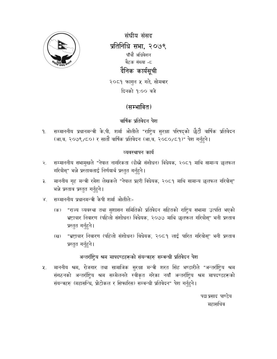 आज संघीय संसदअन्तर्गत प्रतिनिधि सभाको बैठक दिउँसो १ बजे बस्ने कार्यक्रम छ। उक्त बैठकमा प्रधानमन्त्री के. पी. शर्मा ओलीले राष्ट्रिय सुरक्षा परिषद्को छैटौं वार्षिक प्रतिवेदन (आ.व. २०७९/८०) र सातौं वार्षिक प्रतिवेदन (आ.व. २०८०/८१) पेश गर्नेछन्।