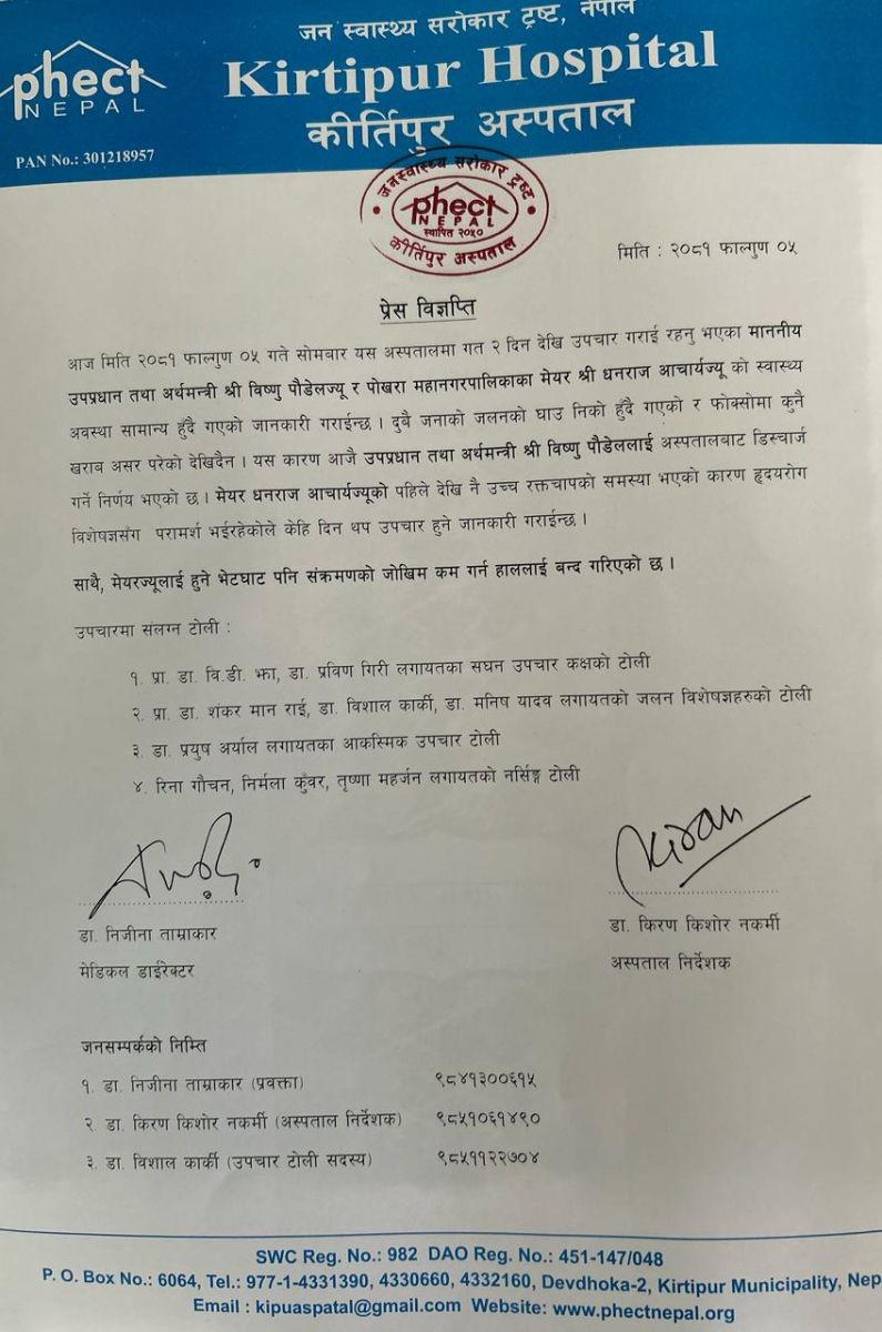 कीर्तिपुर अस्पतालका निर्देशक डा.किरण किशोर नकर्मीले जारी गरेको विज्ञप्तिमा भनिएको छ, 'पछिल्लो २ दिनदेखि उपचार गराई रहनु भएका उपप्रधान तथा अर्थमन्त्री विष्णु पौडेल र पोखरा महानगरपालिकाका मेयर धनराज आचार्यको स्वास्थ्य अवस्था सामान्य हुँदै गएको जानकारी गराईन्छ । दुवै जनाको जलनको घाउ निको हुँदै गएको र फोक्सोमा कुनै खराब असर परेको देखिदैन । यस कारण आजै उपप्रधान तथा अर्थमन्त्री पौडेललाई अस्पतालबाट डिस्चार्ज गर्ने निर्णय भएको छ ।'