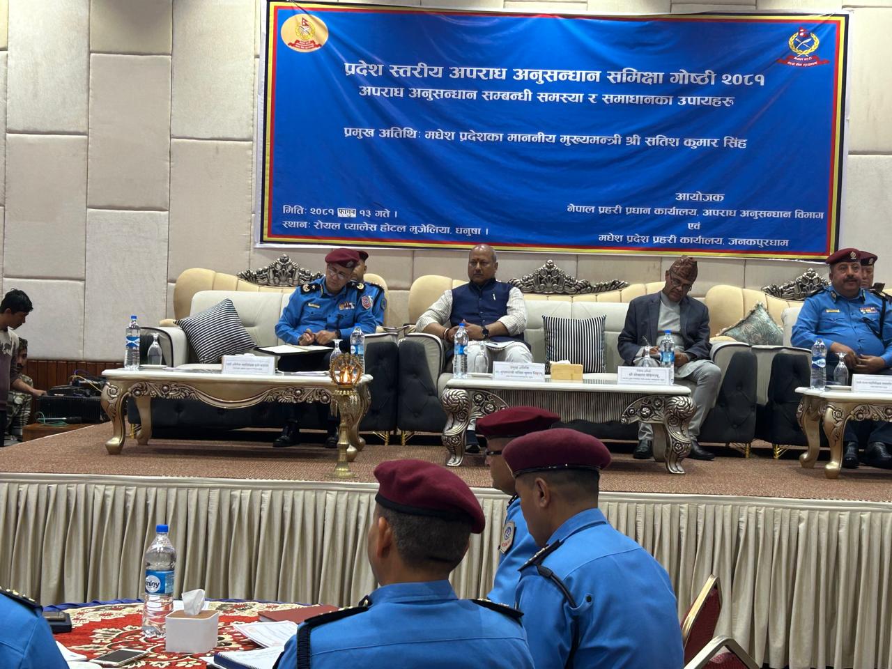 नेपाल प्रहरीको अपराध अनुसन्धान विभाग एवम् मधेस प्रहरी कार्यालय जनकपुरधामद्वारा मंगलबार यहाँ आयोजित अपराध अनुसन्धानसम्बन्धी समस्या र समाधान विषयक प्रदेशस्तरीय समीक्षा गोष्ठीमा उनले अपराध अनुसन्धानको सूक्ष्मता, सघनता, तीव्रता र तटस्थताबाट मात्र सही न्याय निरूपणका लागि ठोस तथा निश्चयात्मक आधार तय हुने हुँदा प्रहरीले अनुसन्धान पद्धतिलाई आवश्यकताअनुसार वैज्ञानिक बनाउँदै जानुपर्ने औंल्याए।