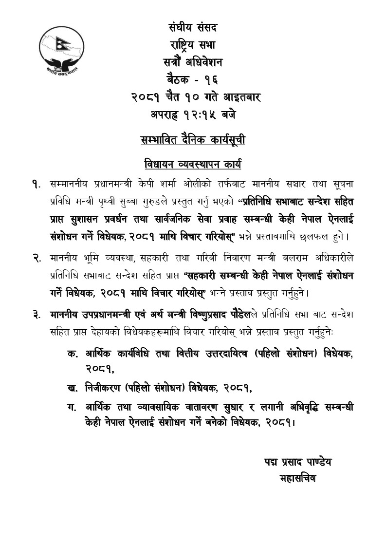 यस्तै, भूमि व्यवस्था, सहकारी तथा गरिबी निवारणमन्त्री बलराम अधिकारीले प्रतिनिधि सभाबाट सन्देशसहित आएको ‘सहकारी सम्बन्धी केही नेपाल ऐनलाई संशोधन गर्ने विधेयक, २०८१’ पेस गर्नेछन् र त्यसमाथि विचार गरियोस् भनेर प्रस्ताव राख्नेछन्।