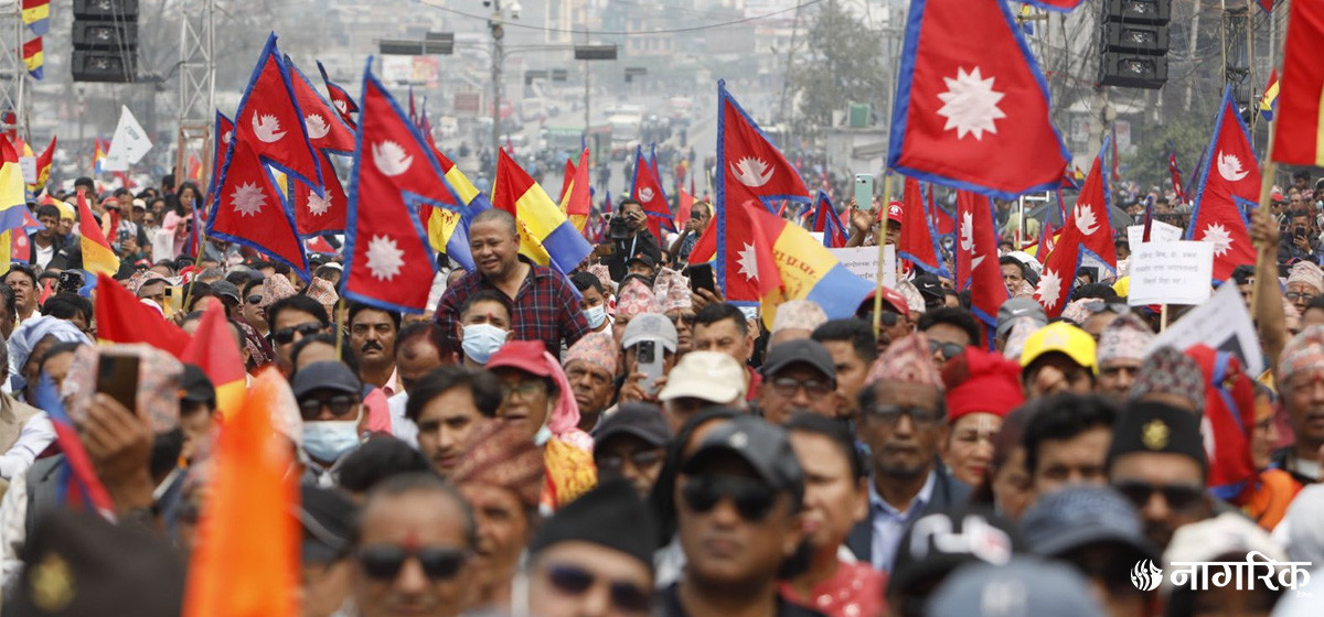 हिन्दु राष्ट्र र संवैधानिक राजतन्त्र लगायतका माग राख्दै राप्रपाले विरोध प्रदर्शन गरेको हो। अहिले राप्रपाका नेताहरूले सम्बोधन गरिरहेका छन् ।