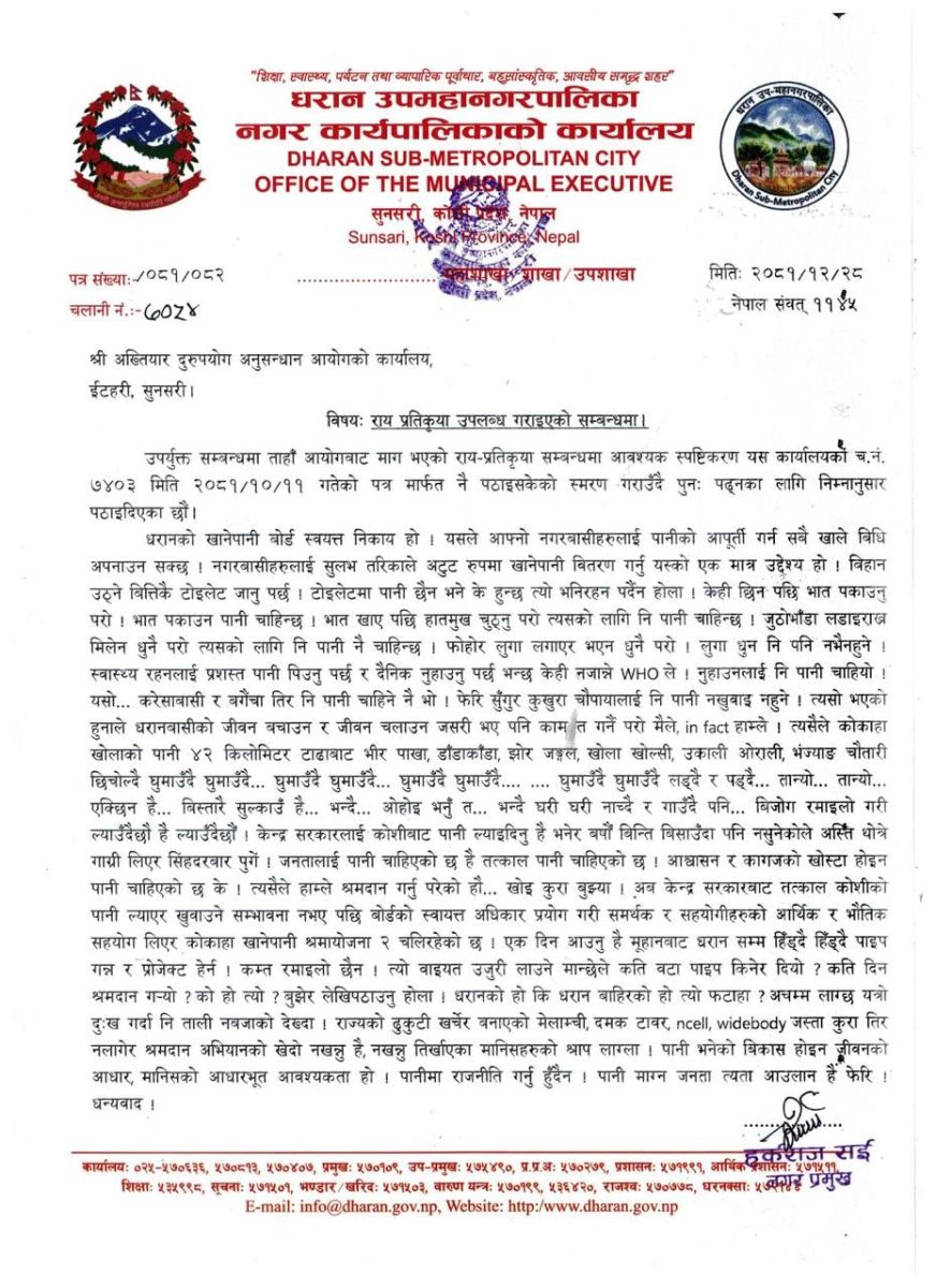 उजुरीसम्बन्धमा उनले गत माघ ११ गते नै 'त्यो वाइयत उजुरी लाउने मान्छेले कति वटा पाइप किनेर दियो ?' भनेर राय प्रतिकृया दिएकोमा पुनः पढ्नका लागि स्पष्टीकरण पठाइदिएको बताएका छन्। धरानको खानेपानी बोर्ड स्वयत्त निकाय भएकाले यसले आफ्नो नगरवासीहरूलाई पानीको आपूर्ति गर्न सबै खाले विधि अपनाउने उनले जवाफमा उल्लेख गरेका छन्।