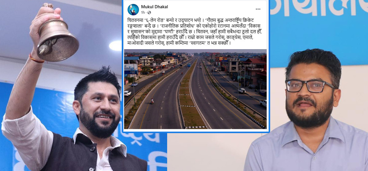 ‘चितवनमा ६ लेन रोड बन्यो र उद्घाटन भयो। गौतम बुद्ध अन्तर्राष्ट्रिय क्रिकेट रङ्गशाला बन्दै छ,’ मुकुलले लेखेका छन्, ‘राजनीतिक प्रतिशोधको एकोहोरो रटानमा अल्मलँदा विकास र सुशासनको मुद्दामा घण्टी हराउँदै छ ।’