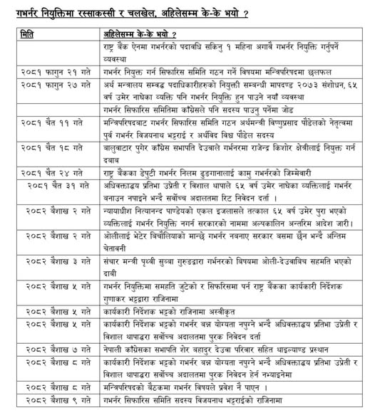 जसमा फागुन २१ गतेको मन्त्रिपरिषद् बैठकले गभर्नर सिफारिस समिति गठन गरेको देखि मङ्गलवार सिफारिस समितिका सदस्य पूर्व गभर्नर विजयनाथ भट्टराईको राजीनामासम्मका १६ वटा गतिविधि उल्लेख छन्।