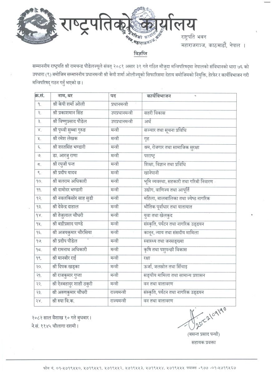 प्रधानमन्त्री ओलीको सिफारिसमा राष्ट्रपति रामचन्द्र पौडेलले मन्त्री नियुक्त गर्ने व्यवस्था छ। पन्तको शपथ बिहीबार गर्ने तयारी छ ।