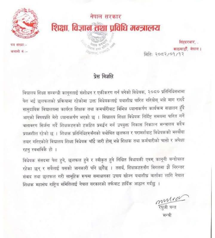 उनले विगतमा झैँ निरन्तर संवाद तथा छलफल गरी सामूहिक रुपमा समाधानका उपाय खोज्न नेपाल शिक्षक महासंघ राष्ट्रिय समितिलाई आग्रह गरेका छन्।