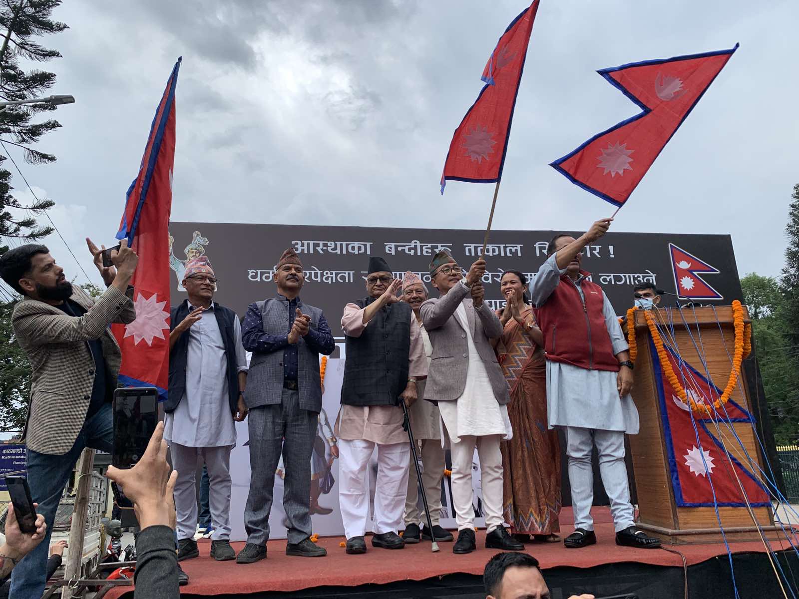 सभाको मुख्य नारा नै उनले ‘आस्थाका बन्दीहरू तत्काल रिहा गर’ भनेर मुल ब्यानरमा लेखाएका छन्। यस्तै सोही ब्यानरमा धर्मनिरपेक्षता र गणतन्त्रको विरोधमा बन्देज लगाउने कानुन बनाउन पाइँदैन’ भन्ने अर्को नारा लेखेका छन्।