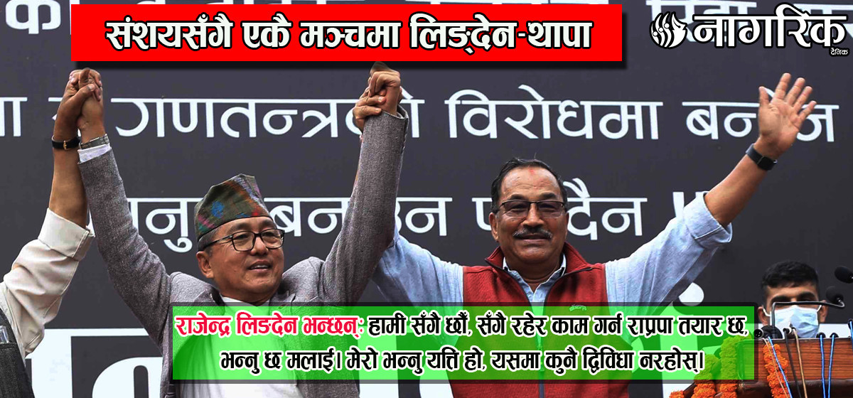 यसबाहेक थापाले रत्नपार्कको सभामार्फत अर्को राजनीतिक चतुर्याइँ पनि गरेका छन्। उनले लिङ्देनले अस्वीकार गरेका संयुक्त जनआन्दोलन समितिका संयोजक नवराज सुवेदीलाई पनि लिङ्देनकै अघि ‘नेता’ स्वीकार्नुपर्ने सुनाए।