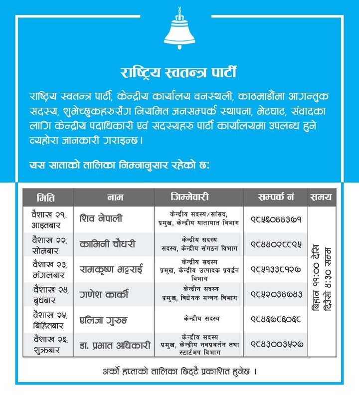 तालिका अनुसार आइतबार शिव नेपाली, सोमबार कामिनी चौधरी, मंगलबार रामकृष्ण भट्टराई, बुधबार गणेश कार्की, बिहीबार एलिजा गुरुङ र शुक्रबार प्रभात अधिकारी केन्द्रीय कार्यालयमा उपस्थित हुनेछन्।