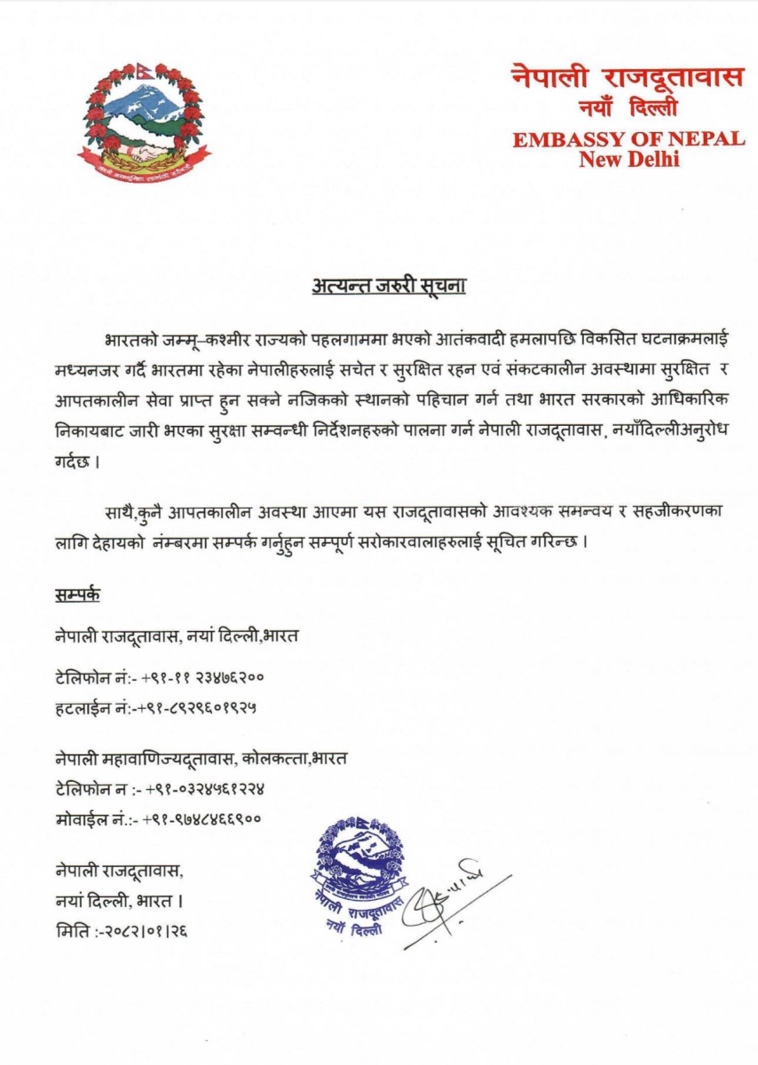 शुक्रबार दूतावासले एक सूचना जारी गर्दै भारतमा रहेका नेपालीलाई संकटकालीन अवस्थामा सुरक्षित र आपत्कालीन सेवा प्राप्त हुन सक्ने नजिकको स्थानको पहिचान गर्न पनि अनुरोध गरेको छ ।