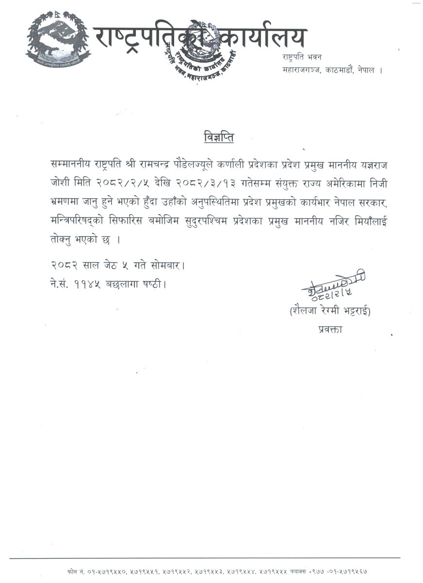 राष्ट्रपति रामचन्द्र पौडेलले सुदूरपश्चिम प्रदेशका प्रमुख नजिर मियाँलाई कर्णाली प्रदेश प्रमुखको कार्यभार सम्हाल्ने गरी जिम्मेवारी तोकेका छन्। कर्णाली प्रदेशका प्रदेश प्रमुख यज्ञराज जोशीको अनुपस्थितिमा उनलाई जिम्मेवारी दिइएको हो।
