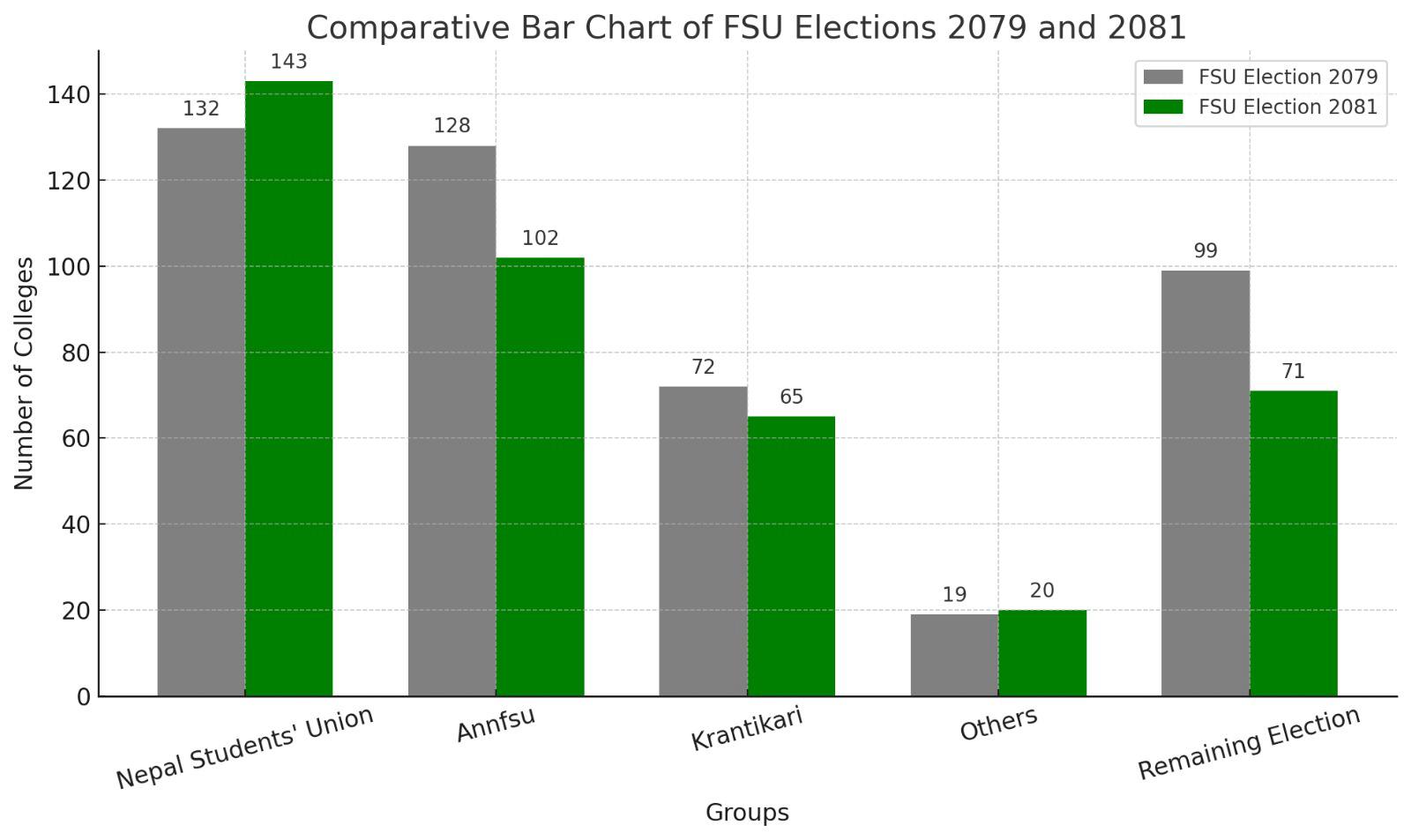 नेविसंका मुख्य-सचिव विजय खड्काले उपलब्ध गराएको तथ्याङ्कअनुसार पछिल्लो निर्वाचनमा नेविसंले १४३, अनेरास्ववियुले १०२ र क्रान्तिकारीले ६५ कलेजमा स्वविय सभापति जितेका छन्। ७१ कलेजमा भने निर्वाचन हुनै सकेन।