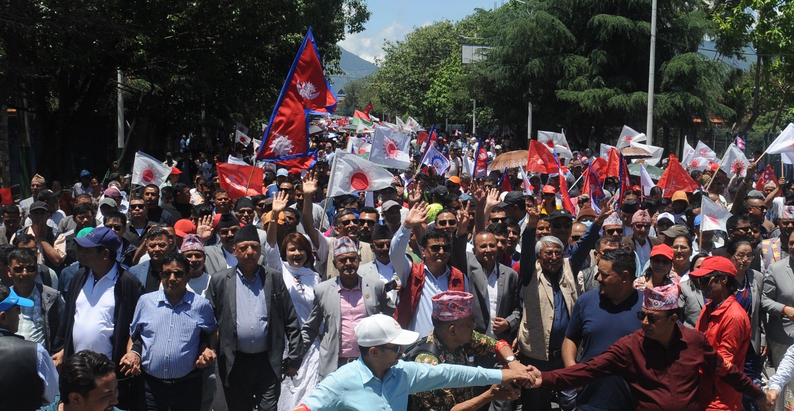 गणतन्त्रमा रमाउने र गणतन्त्र मन नपराउनेबीच बिहीबारको ‘मुकाबला’ सकिएको छ। बिहीबार प्रदर्शनी मार्गमा भएको नेकपा (एमाले)को गणतन्त्र उत्सवका तस्बिर र सोही दिन दिउँसो शान्तिबाटीमा भएको राजवादीको आन्दोलनका दृश्य भने अहिले सामाजिक सञ्जालमा प्रतिश्पर्धा गर्दै छन्।