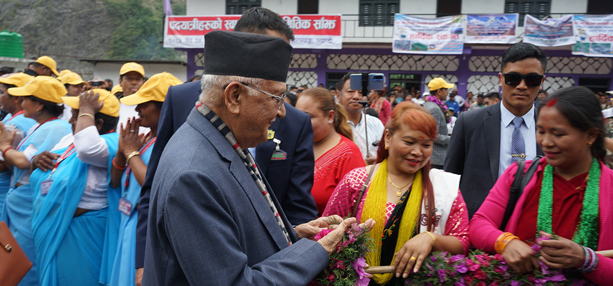 प्रधानमन्त्री केपी शर्मा ओली आज म्याग्दीको अन्नपूर्ण गाउँपालिका–४ नारच्याङ आएका छन्। अन्नपूर्ण हिमाल आरोहण भएको ७५औँ वार्षिकोत्सवका अवसरमा अन्नपूर्ण गाउँपालिकाले आयोजना गरेको कार्यक्रममा सहभागी हुन उनी यहाँ आएका हुन्।