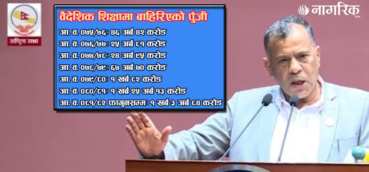 सांसद पौडेलले प्रस्तुत गरेको तथ्यांकअनुसार आव ०७५/७६ मा ४६ अर्ब ४२ करोड, आव ०७६/७७ मा २५ अर्ब ८१ करोड, आव ०७७/७८ मा २४ अर्ब ९५ करोड, आव ०७८/७९ मा ६७ अर्ब ७० करोड, आव ०७९/८० मा एक खर्ब ८२ करोड, आव ०८०/८१ मा एक खर्ब २५ अर्ब १३ करोड र चालु आवको फागुनसम्म एक खर्ब तीन अर्ब ८४ करोड रकम वैदेशिक शिक्षाका नाममा पलायन भएको देखिन्छ।