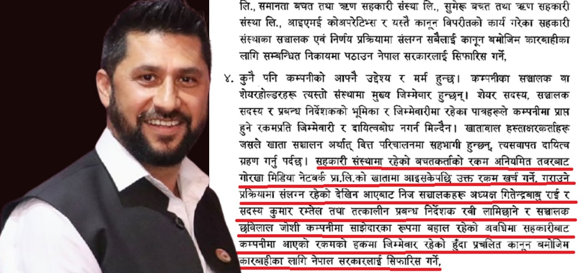 ‘सहकारी संस्थामा रहेको बचतकर्ताको रकम अनियमित तवरबाट गोरखा मिडिया नेटवर्क प्रालिको खातामा आइसकेपछि उक्त रकम खर्च गर्ने, गराउने प्रक्रियामा संलग्न रहेको देखिन आएबाट निज सञ्चालकहरू अध्यक्ष गितेन्द्रबाबु राई र सदस्य कुमार रम्तेल तथा तत्कालीन प्रबन्ध निर्देशक रवि लामिछाने र सञ्चालक छविलाल जोशी कम्पनीमा साझेदारका रूपमा बहाल रहेको अवधिमा सहकारीबाट कम्पनीमा आएको रकमको हकमा जिम्मेवार रहेको हुँदा प्रचलित कानूनबमोजिम कारबाहीका लागि नेपाल सरकारलाई सिफारिस गर्ने,’ समितिले दिएको प्रतिवेदनमा छ।