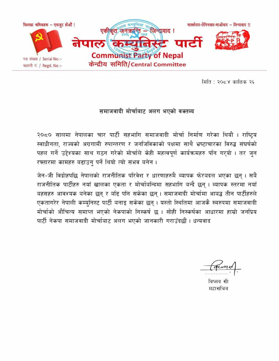 नेत्रविक्रम चन्द ‘विप्लव’ नेतृत्वको नेपाल कम्युनिस्ट पार्टी समाजवादी मोर्चा नेपालबाट औपचारिक रूपमा अलग भएको छ। नेकपाका महासचिव विप्लवले आज एक विज्ञप्ति जारी गर्दै उक्त निर्णय सार्वजनिक गरेका हुन्।