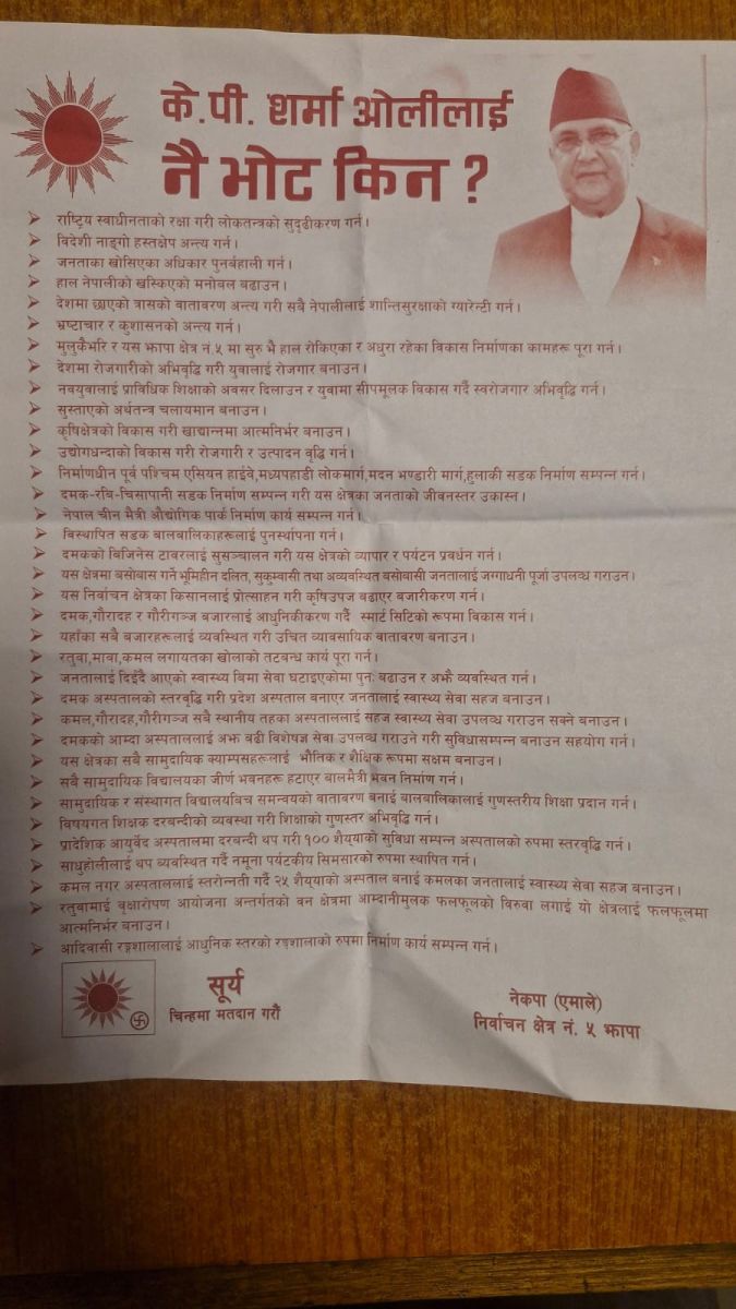 नेकपा एमाले पार्टीको झापा क्षेत्र नम्बर ५ क्षेत्रीय कमिटीले ‘केपी शर्मा ओलीलाई नै भोट किन?’ भन्दै अपिल प्रकाशन गरी राष्ट्रिय स्वाधीनताको रक्षा देखि शिक्षक दरबन्दी मिलानसम्मका विषय समेटिएको बताएको छ ।