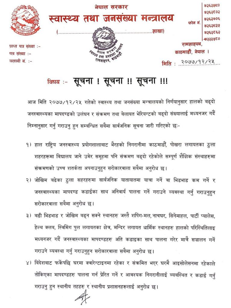 जारी विज्ञप्तीमा घरबाहिर तथा सार्वजनिक स्थानमा जाँदा अनिवार्यरुपमा मास्कको प्रयोग गर्न निर्देशन समेत दिइएको छ। यस्तै, काठमाडौं, पोखरालगायत ठूला शहरहरूमा विद्यालय जाने उमेर समूहमा संक्रमणदर बढेकाले विद्यालयमा स्वास्थ्य मापदण्ड पालना गरेर सङ्क्रमणको उच्च सतर्कता अपनाउन पनि भनिएको छ।
