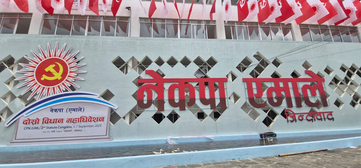 हलको भित्तामा महाधिवेशनको लोगो, नेकपा एमाले र अंग्रेजीमा ‘सीपीएन यूएमल’ले स्वागत गरिएको छ । पानी फोहोराका साना पोखरीमा सेता हाँसका जोडी खेलेको देखिनेछ ।
