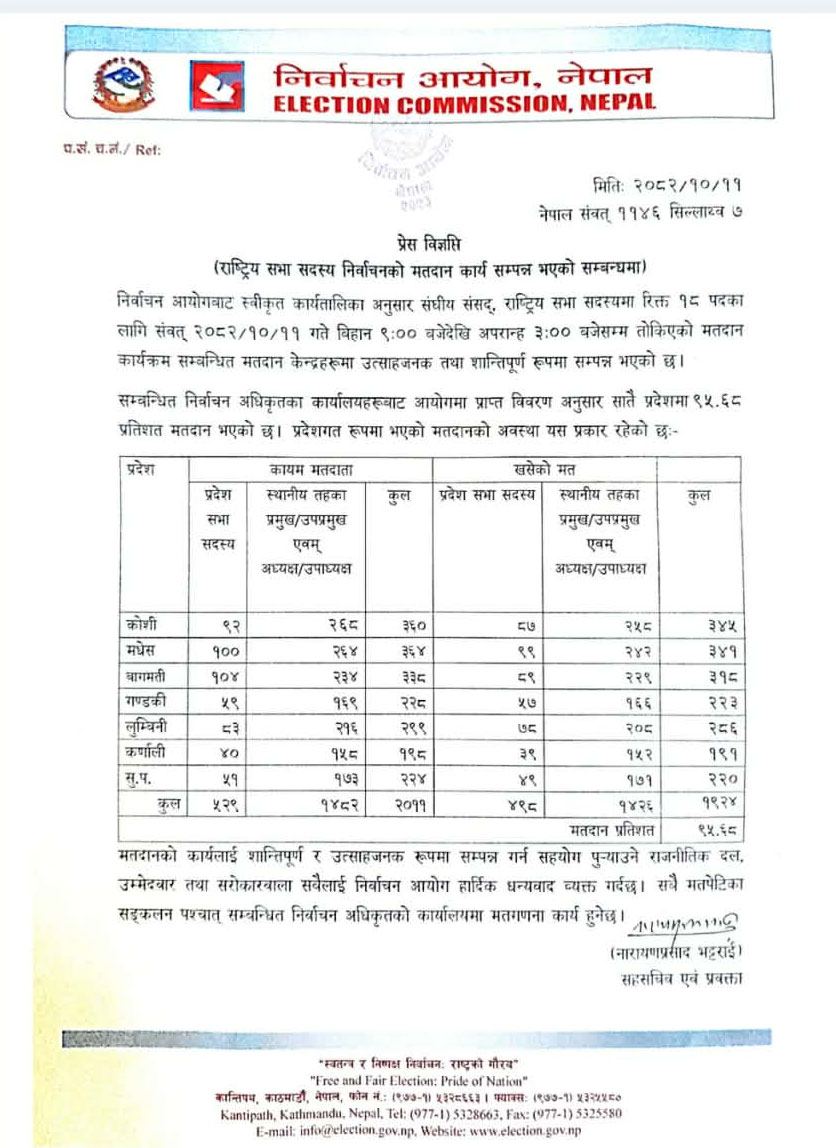 राष्ट्रिय सभा निर्वाचनमा ९५ दशमलव ६८ प्रतिशत मत खसेको छ ।