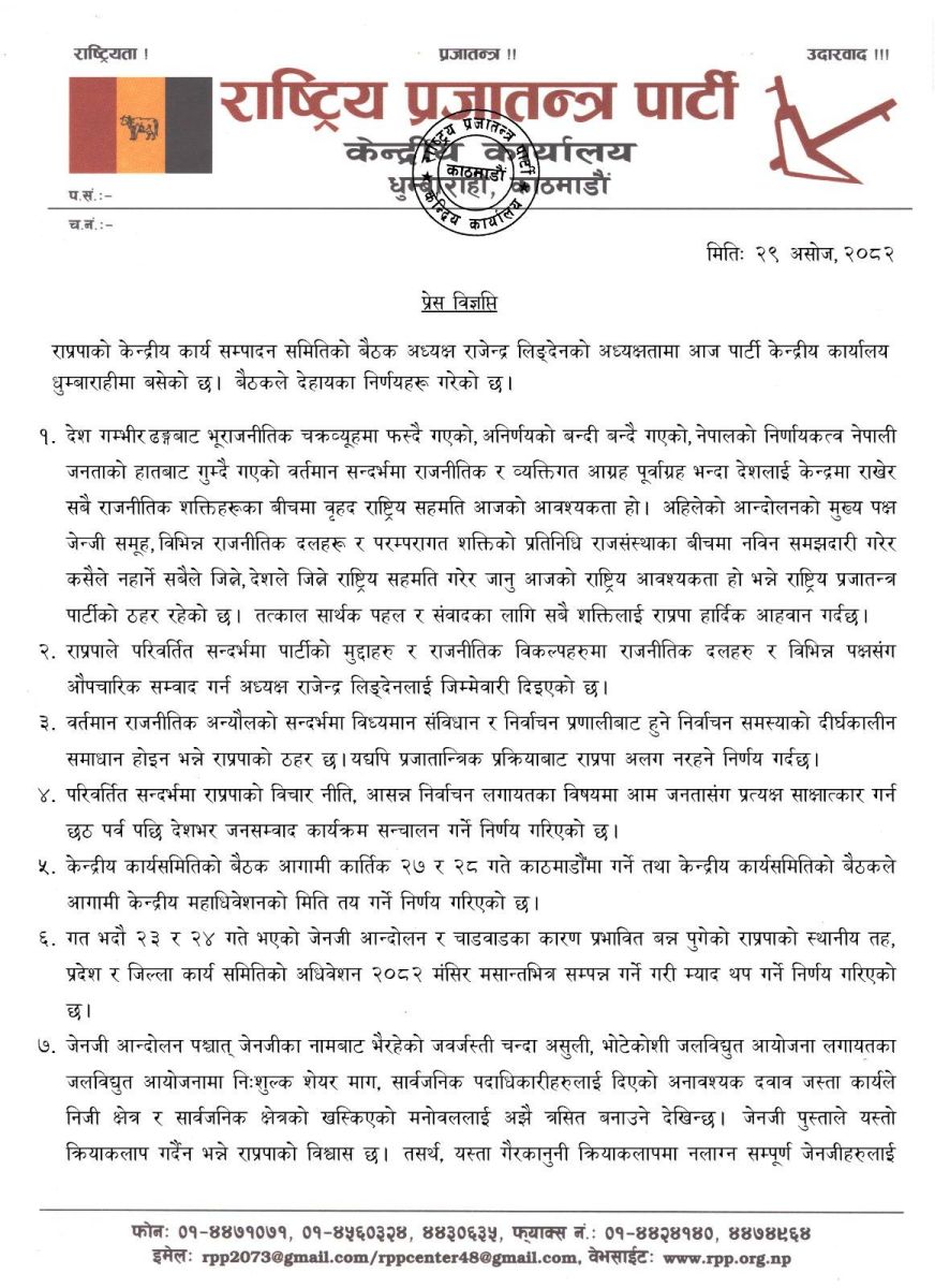 राप्रपाले सरकारलाई आन्दोलनरत पक्षसँग तत्काल सार्थक संवाद गर्न आग्रह गर्दै सबै राजनीतिक शक्तिहरूलाई संवादमा आउन आह्वान गरेको छ।