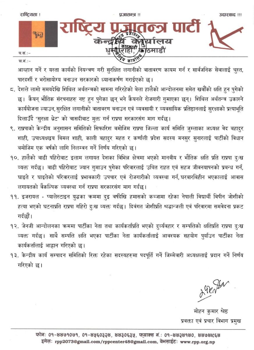 राप्रपाले हालैको जन- जी आन्दोलनका क्रममा भएका केही गतिविधिप्रति गम्भीर ध्यानाकर्षण भएको जनाएको छ। जवर्जस्ती चन्दा असुली, मोटरसाइकल जलाउने, जलविद्युत आयोजनामा निःशुल्क शेयर माग्ने तथा सार्वजनिक पदाधिकारीहरूलाई अनावश्यक दबाब दिने जस्ता कार्यले निजी र सार्वजनिक क्षेत्रको मनोबल गिराएको भन्दै त्यस्ता क्रियाकलाप नगर्न सम्बन्धित पक्षलाई आग्रह गरिएको छ।