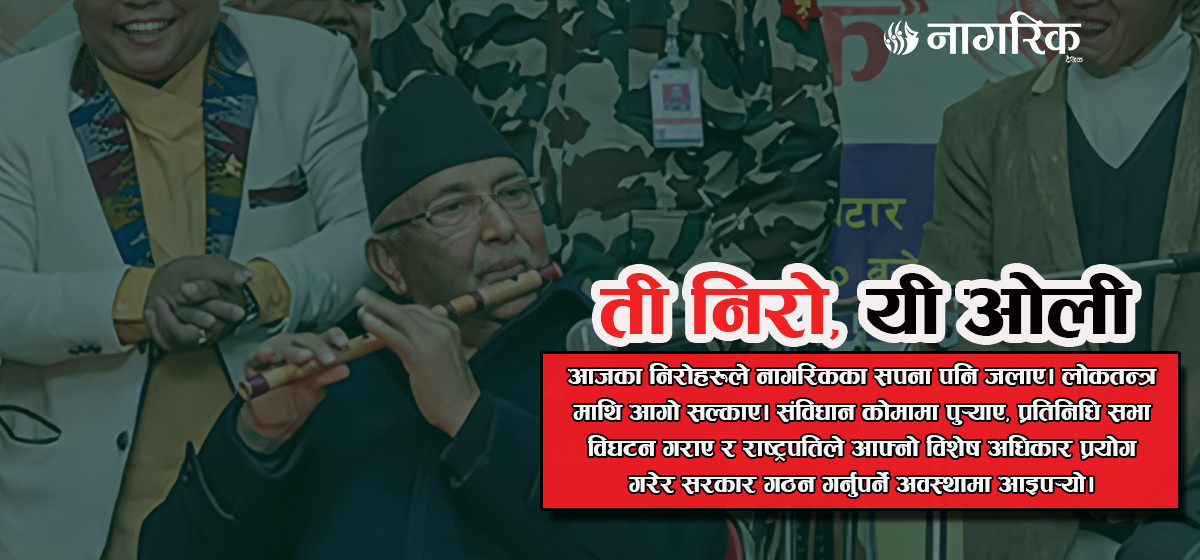 विगतमा ओलीले आफ्नो प्रतिरक्षाका लागि ‘साइबर सेना’ बनाएर झोसेको आगोले अन्ततः उनलाई सत्ताबाट बाहिर ल्याएन राजनीतिक दलहरूको क्षमतामाथि नै प्रश्न उठ्यो। यसले सहरको सरकारी र निजी भौतिक पूर्वाधार मात्र होइन आजका निरोहरूले नागरिकका सपना पनि जलाए। यति मात्र होइन, लोकतन्त्र माथि आगो सल्काए। जसले संविधानलाई कोमामा पुर्यायो, प्रतिनिधि सभा विघटन गरायो र राष्ट्रपतिले आफ्नो विशेष अधिकार प्रयोग गरेर सरकार गठन गर्नुपर्ने अवस्थामा आइपर्यो।