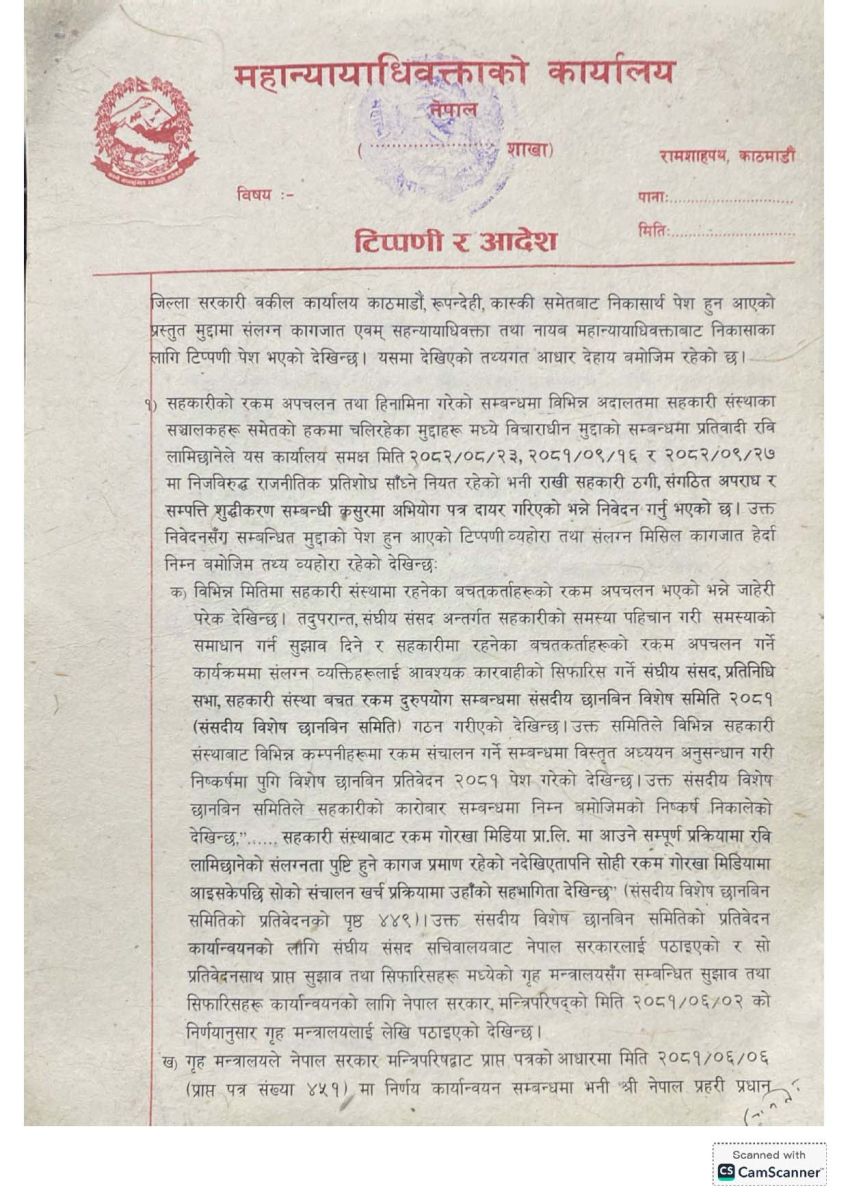 महान्यायाधिवक्ताको कार्यालयले राष्ट्रिय स्वतन्त्र पार्टी (रास्वपा) का सभापति रवि लामिछाने सहकारीको रकम अपचलन गरी गोर्खा मिडिया नेटवर्कमा ल्याउने प्रक्रियामा संलग्न नभएको निष्कर्ष निकालेको छ।