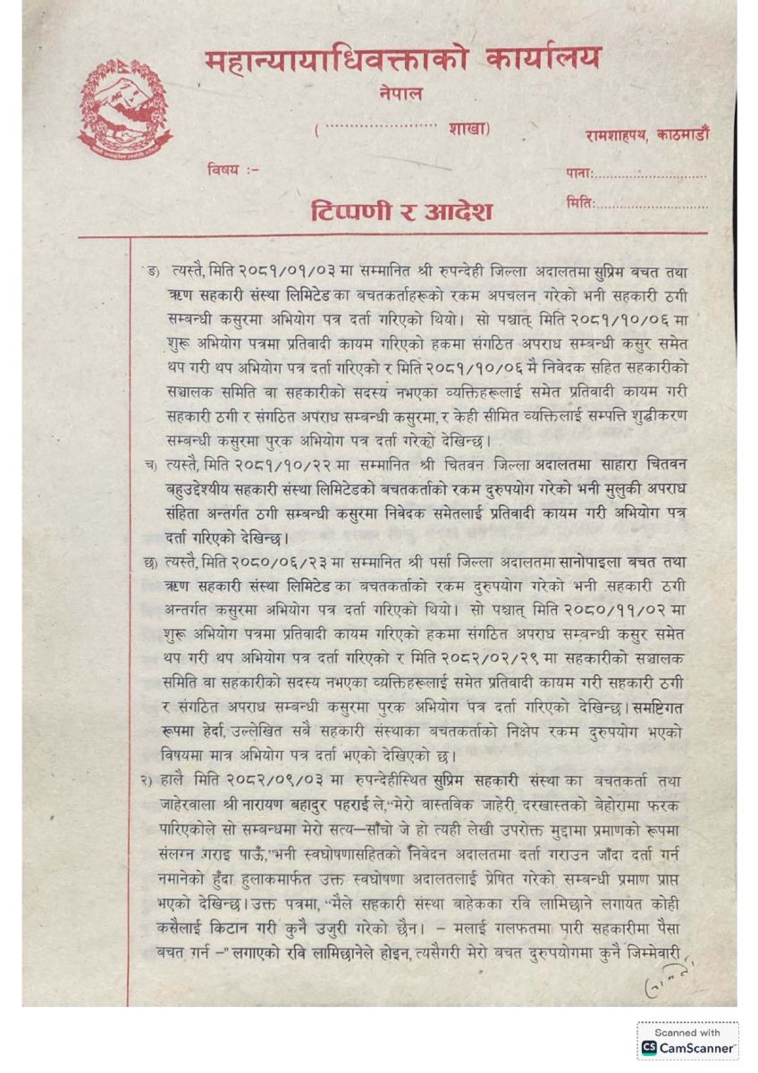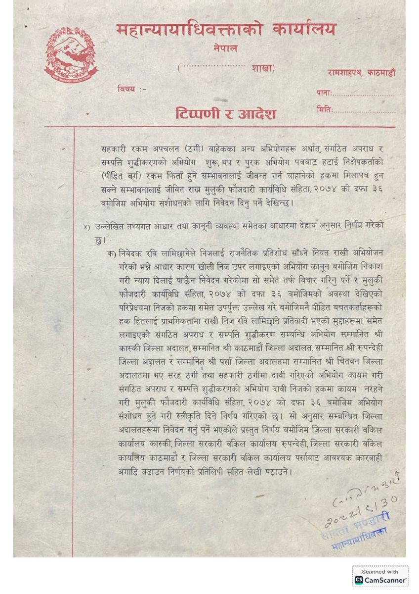 विभिन्न जिल्ला अदालतमा विचाराधीन मुद्दाहरूमा अभियोगपत्र संशोधन गर्ने अनुमति दिँदै महान्यायाधिवक्ता कार्यालयले लामिछानेमाथि संगठित अपराध र सम्पत्ति शुद्धीकरणको कसुर पुष्टि हुने आधार नदेखिएको ठहर गरेको हो।